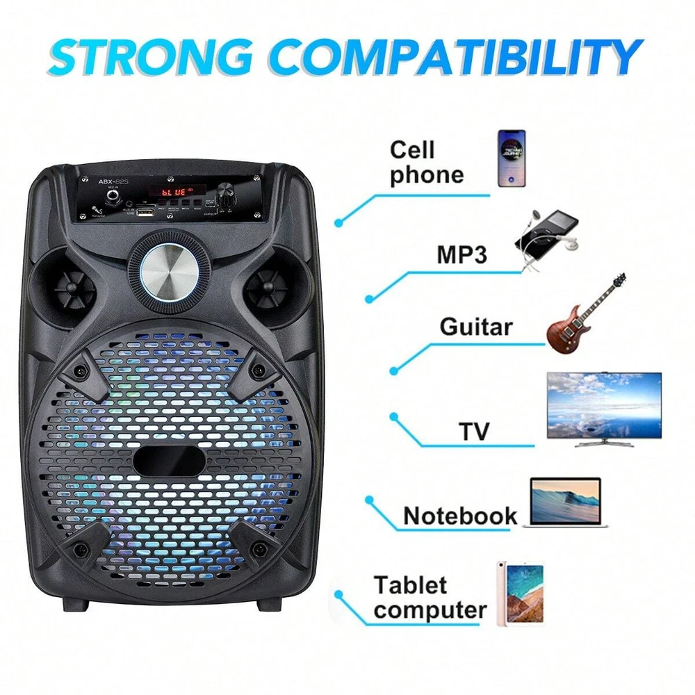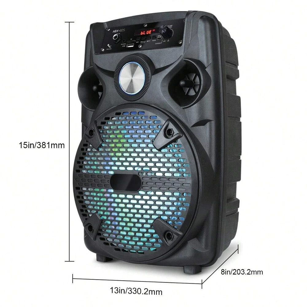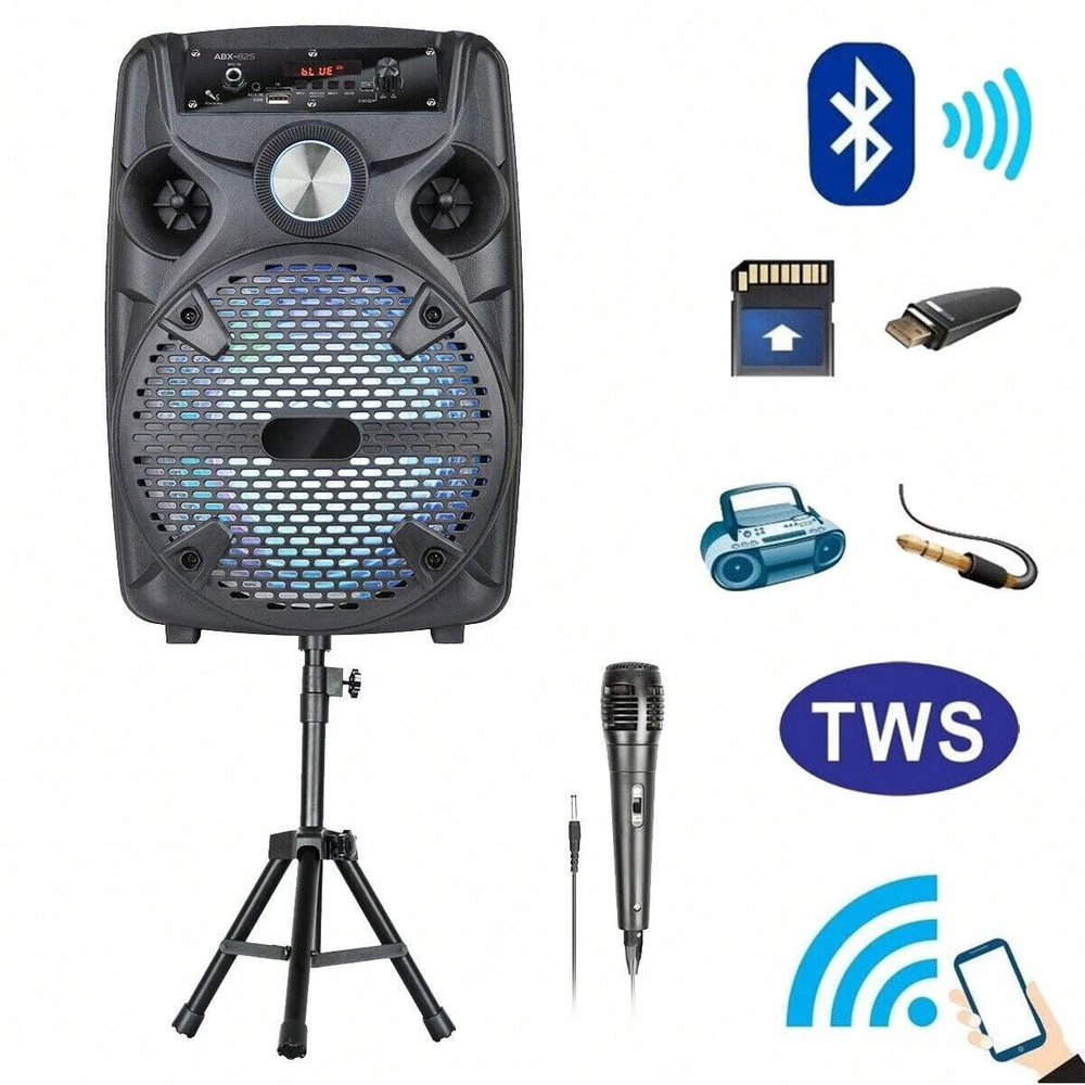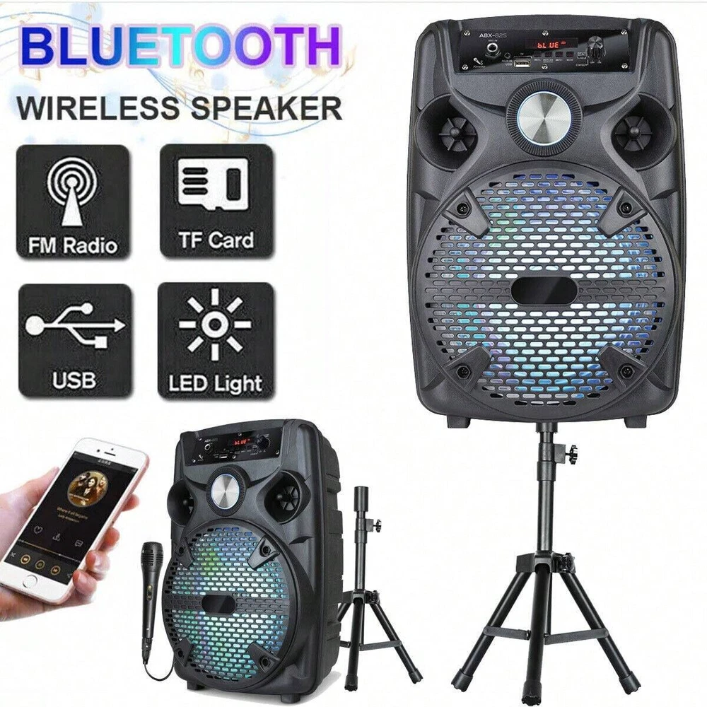 Feature: Unbelievable sound: 8" Woofer of pure audio power with enhanced bass. Connect and play music or song wirelessly via the built in Bluetooth from your iPhone, iPad, Android smartphone, Android tablet, PC, other MP3 devices or via USB flash drive. Two ways of power supply:AC/12V 3.2Ah Built-in Rechargeable Battery 8 Inch High Powered Portable Speaker System Support Memory Card,BT,FM,AUX Function Multi-media Function Music Player, with guitar input MIC Input with 1/4 Connect for to sing like karaoke Mounting Tripod Stands Included With Hemispherical LED Disco Colorful Linghting 8 Inch HIFI DISCO with Ambient Lights Bluetooth Speakers, Big Sound, Big Sound with Colorful Lights , for family gatherings, parties, shows, etc. Ideal for personal indoor home use or for outdoor. Includes the latest decoding chips supporting stable playback of MP3 up to 32GB USB disk/TF card (not included). Specification: Audio input: memory card/BT/FM/AUX Speaker Dimensions: 8" subwoofer Power supply: AC110-240V 50Hz/60Hz Output power: 1100W Frequency Response: 45Hz-18KHz Sensitivity: 85±2dB Battery capacity: 12V/4.5A rechargeable battery Colour: Black Package Included: 1 x 8" Wireless Party Speaker 1 x Wired Microphone 1 x Speaker Stands 1 x Charging Cable 1 x User Manual