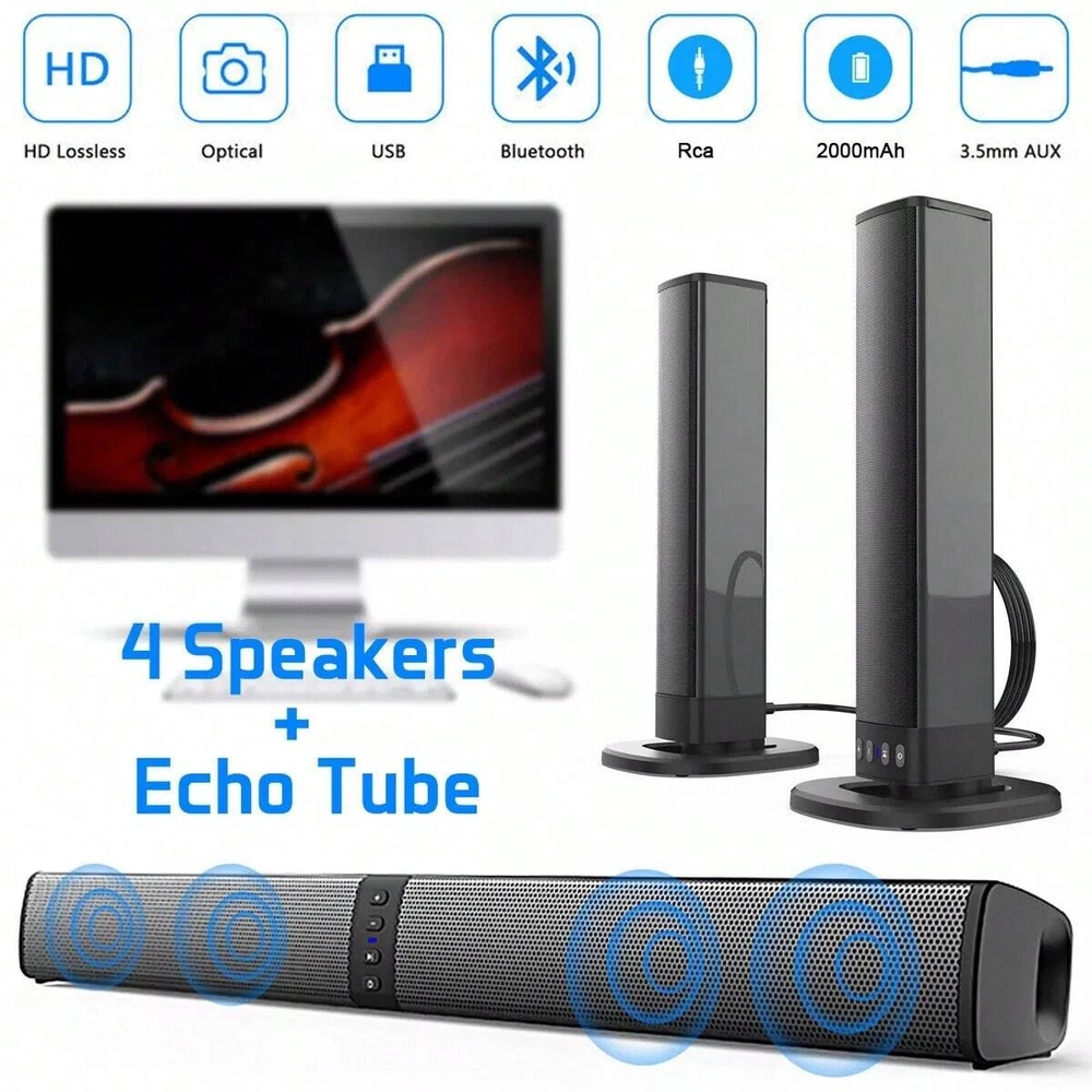 Feature: Innovative Detachable Design The detachable speaker design gives you the versatility in placing one speaker in a horizontal layout at the base of your TV or as two separate free standing vertical speakers. Louder and Crisper Enjoy a louder and crisper audio experience which your TV can't deliver. Wired or Wireless Connections Compatible with your TV, Phone, Laptop, Echo thanks to Bluetooth or wired connections that include 3.5mm audio cable, USB, RCA cable, also with TF card playing function. Flexibly Placing Fashion and portable design suits any home decoration. Bluetooth input and TF card input for savoring your stereo music good time everywhere. Easy to Control and Operate It features LED indicator light and sensitive button, much easier for users to operate. 4 Full Range High Quality Speaker Completes your home theatre system and brings the great bass, provides you a loud and clear surround audio experience in the bedroom and living room. Function: Use Bluetooth V5.0 version USB interface, U disk audio input function TF card audio input function 3.5mm audio input FM radio function Adopt Type-C charging port Can control the volume addition and subtraction Can control the song up and down Can control the pause and play of songs Connect to computer and TV Specification: Bluetooth version: 5.0 SNR: -80dB Output power: 5W x 4 Frequency response: 20Hz - 20KHz FM Frequency:87.5Hz-108Hz Transmission power: 1.49mW Transmission frequency: 2.48GHz Bluetooth distance: 8 - 10m Charging time: 2 - 3 hours Standby time: 120 hours Charging plug: TYPE-C Charging voltage: 5V/1A Bluetooth profiles supported: A2DP, AVRCP, HSP and HF Battery Capacity: 2000mAh (built-in) Package weight: 2.7lbs Product Size(L x W x H): 40 x 14.5 x 7cm Scope of Application: Smart Devices with Bluetooth, TVs, Computers, etc. Package List: 1 x Speaker 2 x Base 1 x USB Cable 1 x RCA Cable 1 x Audio Cable 1 x User Manual in English