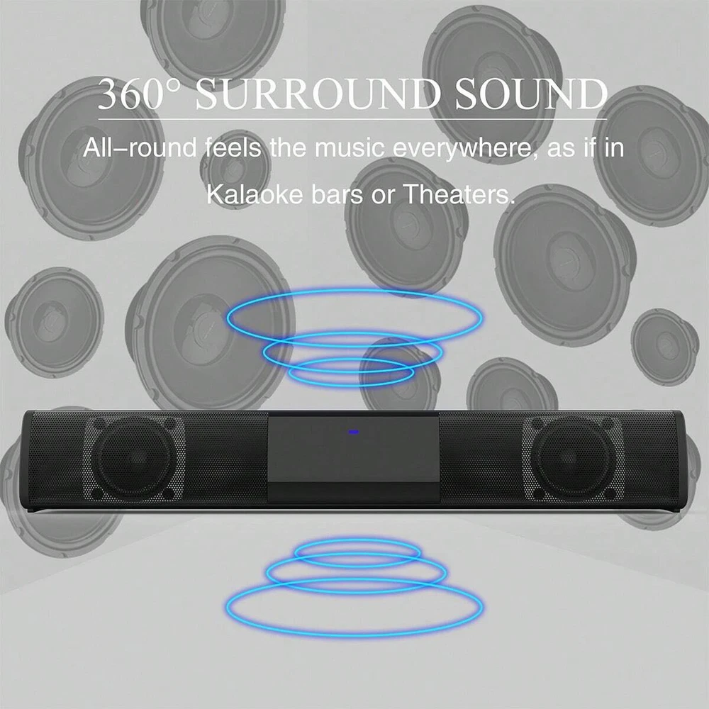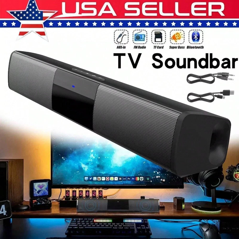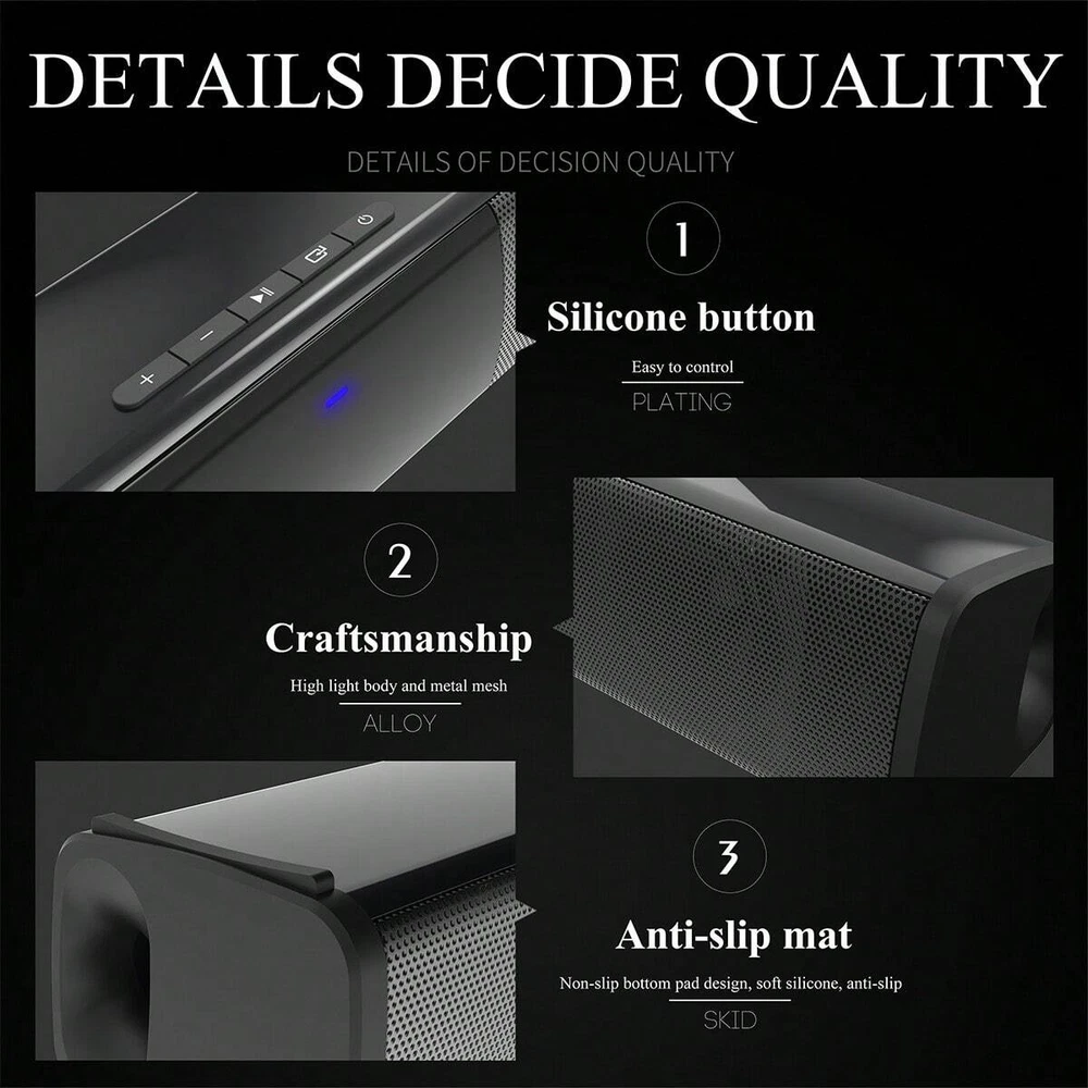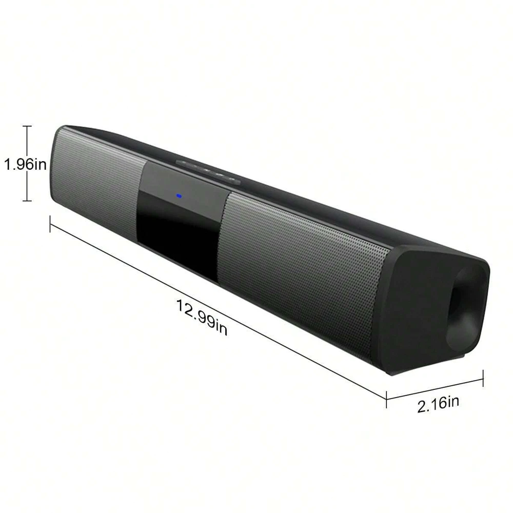 Features: [Mini & Slim Design]The BS-28A is a small and slim audio speaker device that is perfect for placing on a desk or comfortably under a TV.An ideal TV or computer speaker that will bring life to your room and immerse you in cinematic sound in the comfort of your own home [TWS Pairing Function] You can purchase two speakers at the same time to truly enjoy the surround sound of a movie theater by pairing the TWS function, it's an auditory experience that's truly unparalleled. [Bass Sound & Stereo]Upgraded with Volume Quality and Control. Bulit-in two higt-power speakers + DSP bass technology. Steady and lossless bass sound effect and stereo surrounding sound loudspeakers bring you wonderful music. The sound of the small volume speaker is loud and penetrating , perfoms sounds that touch the soul. [4 WAYS TO CONNECT: Bluetooth 5.0+TF Card+AUX+U Disk]Multiple wireless and wired connections, easily connect to the sound bar via Bluetooth 5.0, Coax or AUX audio cable. No matter what devices you use, enjoy unparalleled access with multiple connection methods available. Easily enjoy the high-quality stereo experience of the home theater. Suit for some TVs or Smartphones, PC, DVD, Tablets, Projectors etc Support U Disk playback. [2 X 5W Powerful Built-in Subwoofers]HD stereo speaker immersive music bass boost, rich in layers. So soft and shocking, internal magnetic horn, the volume is louder. With the sleek look, our soundbar is easily incorporated in your home with a fashionable take. [Portable and Rechargable] The 12.99'' light-weight body allows you to take the great sound experience with you anywhere you go. However, the small body does not play games! This Bluetooth speaker comes with a 2000mAh battery and supports up to 5 hours of music playback. Specifications: Type:TV Sound Bar Color:Black Material:ABS+Metal Bluetooth Version:5.0 Power:10W(5W X 2) Input Voltage: 5V 1A Power Supply:Type-C Charging(cable included) Battery Capacity:2000mah Charging Time:2-3 hours Play Time:2 hours(full charged at max volume) Dimension:12.99x 2.16x 1.96 inches Frequency: 20-20KHz FM Frequency:87.5Hz-108Hz Multiple playback mode:Bluetooth;FM;AUX;TF card;USB Flash Drive Supporting audio formats:MP3/WMA/WAV/FLAC/APE Package Included: 1 x TV Sound Bar 1 x USB Charging Cable 1 x AUX cable 1 x User menual