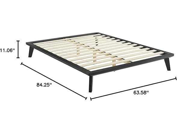 DeCoro Metro Wood Platform Bed, Queen Condition: New Features The Canton Wood Platform Bed is simple yet sophisticated and can work in any home decor style. Its unique 10-inch legs are slightly angled to give that modern retro vibe while the classic wood slats and platform bed is solid enough to support your mattress without the need for a box spring. The platform bed comes in a wide variety of colors and sizes and is easy to assemble so you’ll have your charming bedroom put together before you know it. Add our Canton 4-Drawer Wood Dresser, Two-Drawer Top Storage Hutch, and Nightstand, for an awesome room setting that takes you back but doesn't take all your money. Classic Brands carries a wide variety of platform bed frames and bedroom furniture in an assortment of designs to match your unique taste and style. 10-inch legs with 8.5-inches of storage space beneath No Box Spring Required Easy Assembly; all parts, instructions, and tools are neatly packed in shipping carton; easy to disassemble for storage or moving Frame and solid wood slats are included (mattress sold separately) Specs In the Box: (1) DeCoro Metro Wood Platform Bed, Queen Specifications Item Dimensions: 84.25"L x 63.58"W x 11.06"H Item Weight: 55 pounds Ground to Item Distance: 8.5 inches Weight Supported: 250 pounds Material: Wood Compatible with Mattress Size; Queen Assembly Required: Yes Care Instructions: Clean this item only with a damp cloth. Do not use bleach or abrasive cleaners.