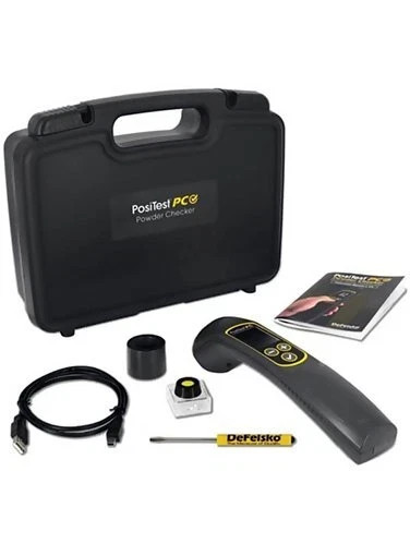 DeFelsko PosiTest PC-B Powder Checker The PosiTest® PC Powder Checker® is a fast, stand-alone gauge designed to measure uncured powder coatings using non-contact ultrasonic technology. It predicts cured thickness quickly and accurately—ideal for moving lines, swinging parts, and complex shapes. Key Features Ready to use out of the box Up to 4× faster measurement speed Easy-to-read digital display with simple icon menu Handheld, lightweight, battery-operated No calibration adjustment needed for most powders Target Grid helps with distance and alignment Solvent, acid, oil, water, and dust resistant Hard-shell case and replaceable sensor screen Conforms to ASTM D7378 Stores up to 999 readings with onscreen averaging Scan Mode for continuous measurement USB connectivity and software updates Specifications Range: 20–100 µm (0.8–4.0 mils) Resolution: 1 µm (0.1 mil) Accuracy: ±5 µm (±0.2 mil) Measurement time: 1–3 seconds Distance to powder: 19 mm (0.75 in) Measurement area: 2 mm (0.08 in) Warranty: 2 years Country of origin: USA