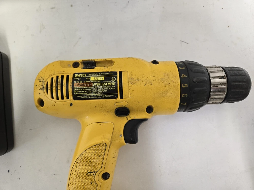 Battery Included:YesSet Includes:TOOL, BATTERY, CHARGERNumber of Batteries:1Brand:DEWALTNumber of Items in Set:3Voltage:12VAuxiliary Handle:NoMPN:Does not ApplyBattery Technology:LITHIUM-IONChuck Size:3/8Color:YELLOW/ BLACKType:DRILLPower Source:CORDLESSModel:DW953