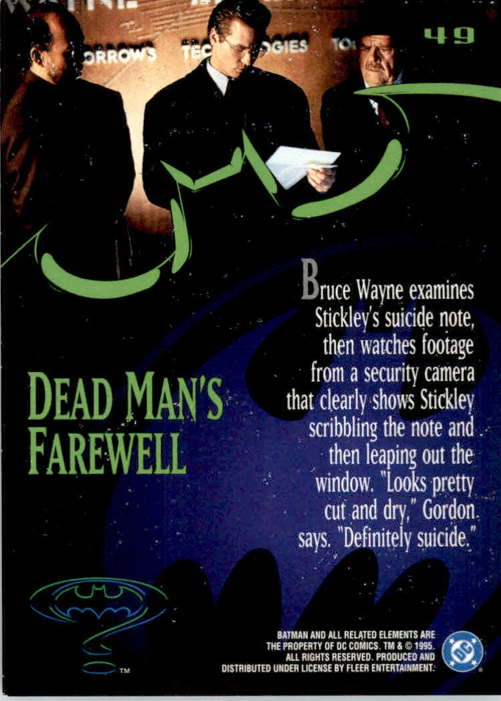 Season: 1995 Graded: No Set: 1995 Ultra Batman Forever Year Manufactured: 1995 Franchise: NON_SPORT Card Number: 49 Autographed: No Player/Athlete: Dead Man's Farewell Type: Non-Sport Trading Card