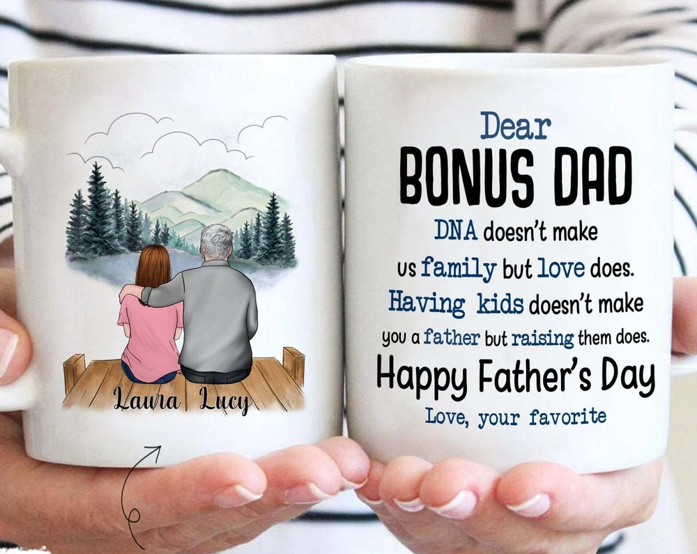 Dear Bonus Dad Mug Father's Day Mug Personalized Bonus Dad Mug Step Dad Mug Product Details.. This high quality 11oz. ceramic white mug has a premium hard coat that provides crisp and vibrant color reproduction sure to last for years. Perfect for all hot & cold beverages. The highest quality printing possible is used. It will never fade no matter how many times you wash it. Material: 100% Ceramic. Print both sides. Dishwasher and Microwave Safe. High Gloss + Premium White Finish. Printed in the U.S.A. Personalized & Custom. We support personalized and custom mug to add custom, when placing an order, you can add notes to the "order note" in shipping address section. Also you can contact us directly via message. Shipping Info. Ready to ship in 1 to 2 business days, All products are made-to-order and proudly printed in the United States. Shipped by USPS and DHL, You will receive your order in 5-7 days. Replace & Refund. All products are defective during shipping broken, chipped will be replaced free of charge. You are not satisfied with the product, we will refund 100% money to you. If any other issues arise, please do not hesitate to message, we would be more than happy to assist you.