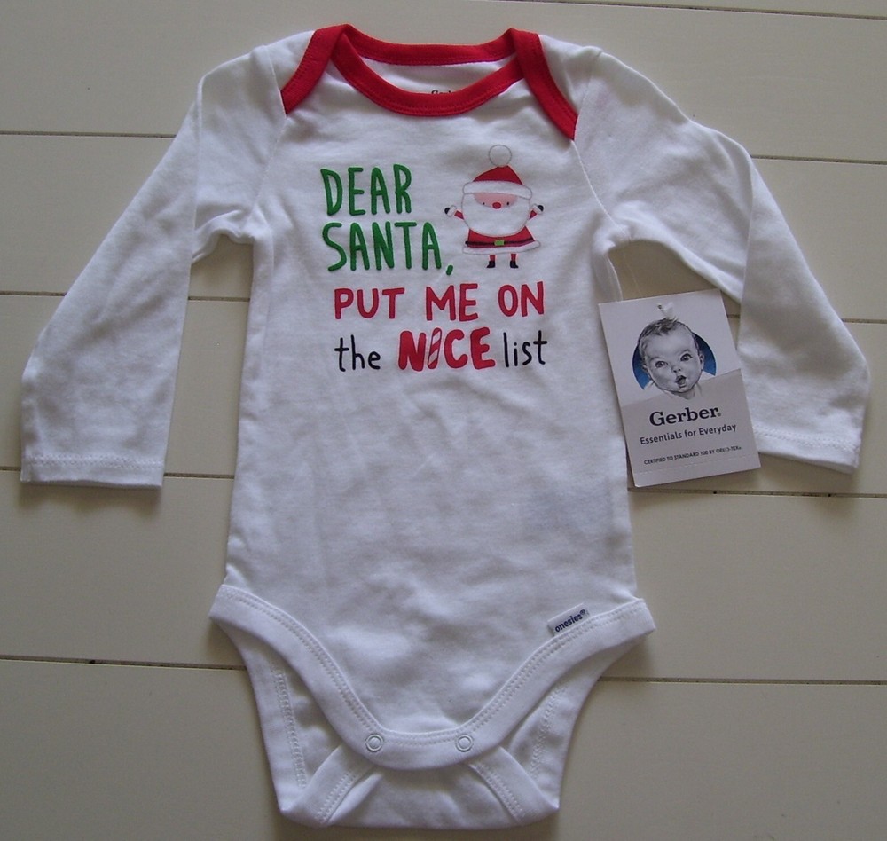 Gerber 3 Pc Dear Santa Put Me On the Nice List Christmas Long Sleeve Bodysuit, Pants, and Hat Outfit. Size 3-6 Months. New with tags. Weight: 12-16 Pounds Height: 24-26 Inches Smoke and Pet free home. Winning bidder to pay within 3 days listing end. Check out my other listings for more great deals! RETURN POLICY DETAILS Returns are accepted with prior approval ONLY if item is misrepresented in the listing. You must contact me first before returning an item. I do NOT accept returns for buyer choosing the wrong size/item not fitting. There are NO returns/refunds on pageant and special occasion wear.