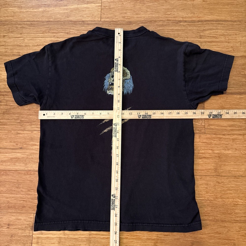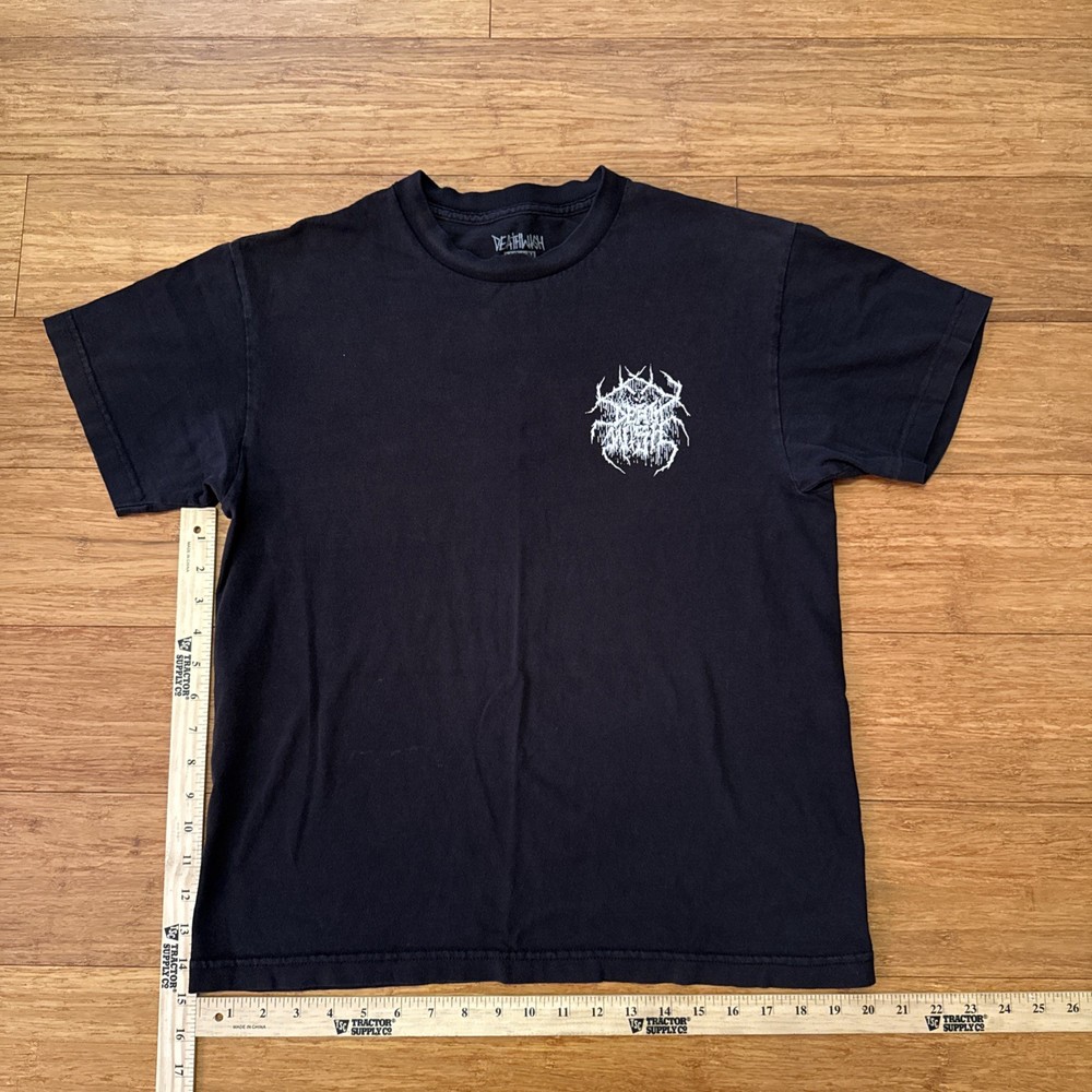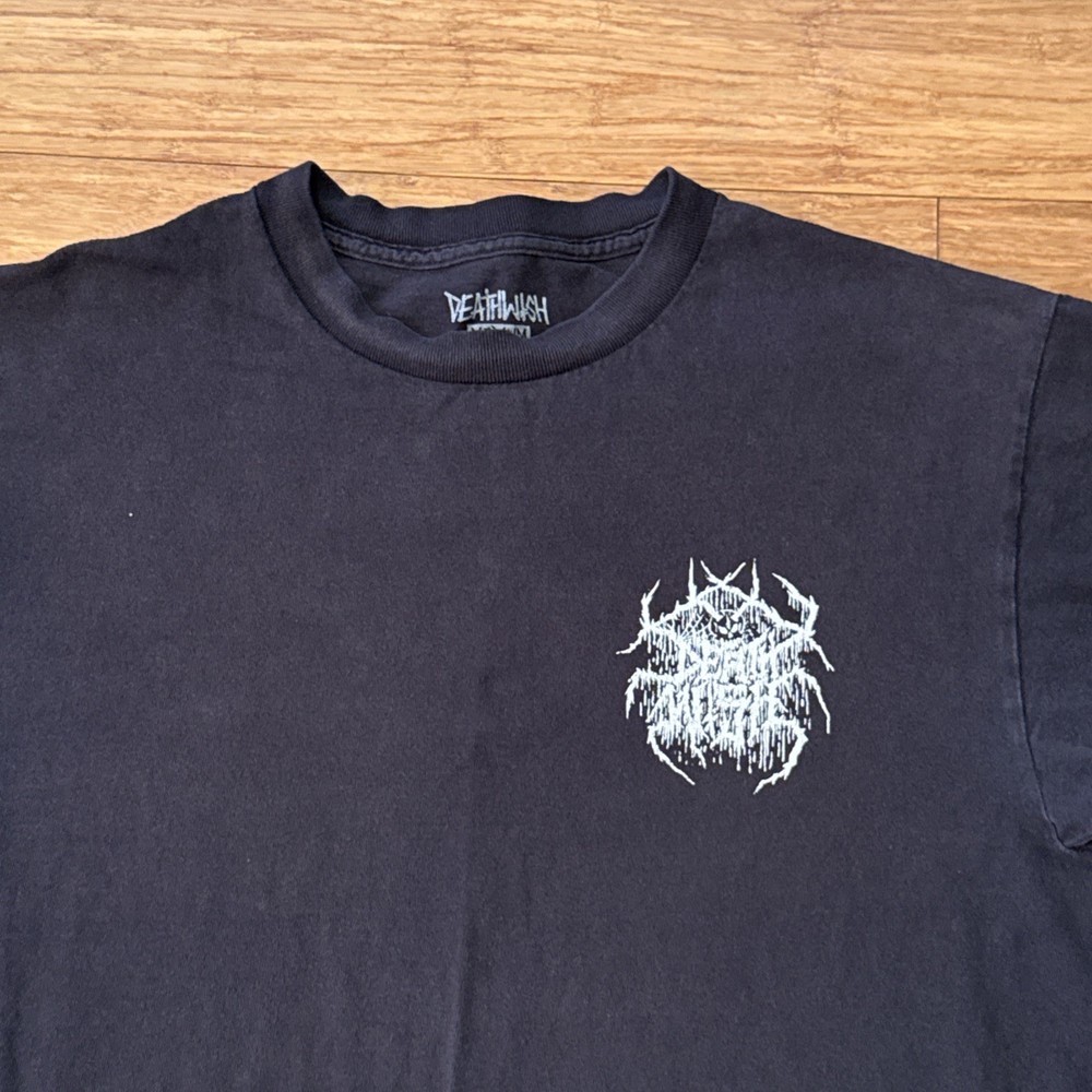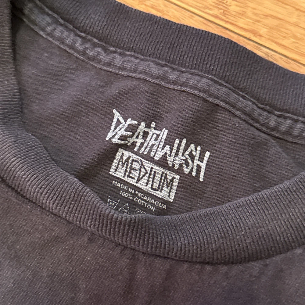 The Deathwish Shirt is a men's medium black t-shirt featuring a graphic print of a zombie, perfect for fans of skateboarding and grunge. Made of cotton with a crew neck and short sleeves, this regular fit shirt is ideal for all seasons including summer, fall, and spring. The tagless design adds comfort and the Deathwish brand adds a touch of edgy style to this classic wardrobe staple. Made in Mexico, this t-shirt is a must-have for those who appreciate a blend of dark humor and skateboarding culture.
