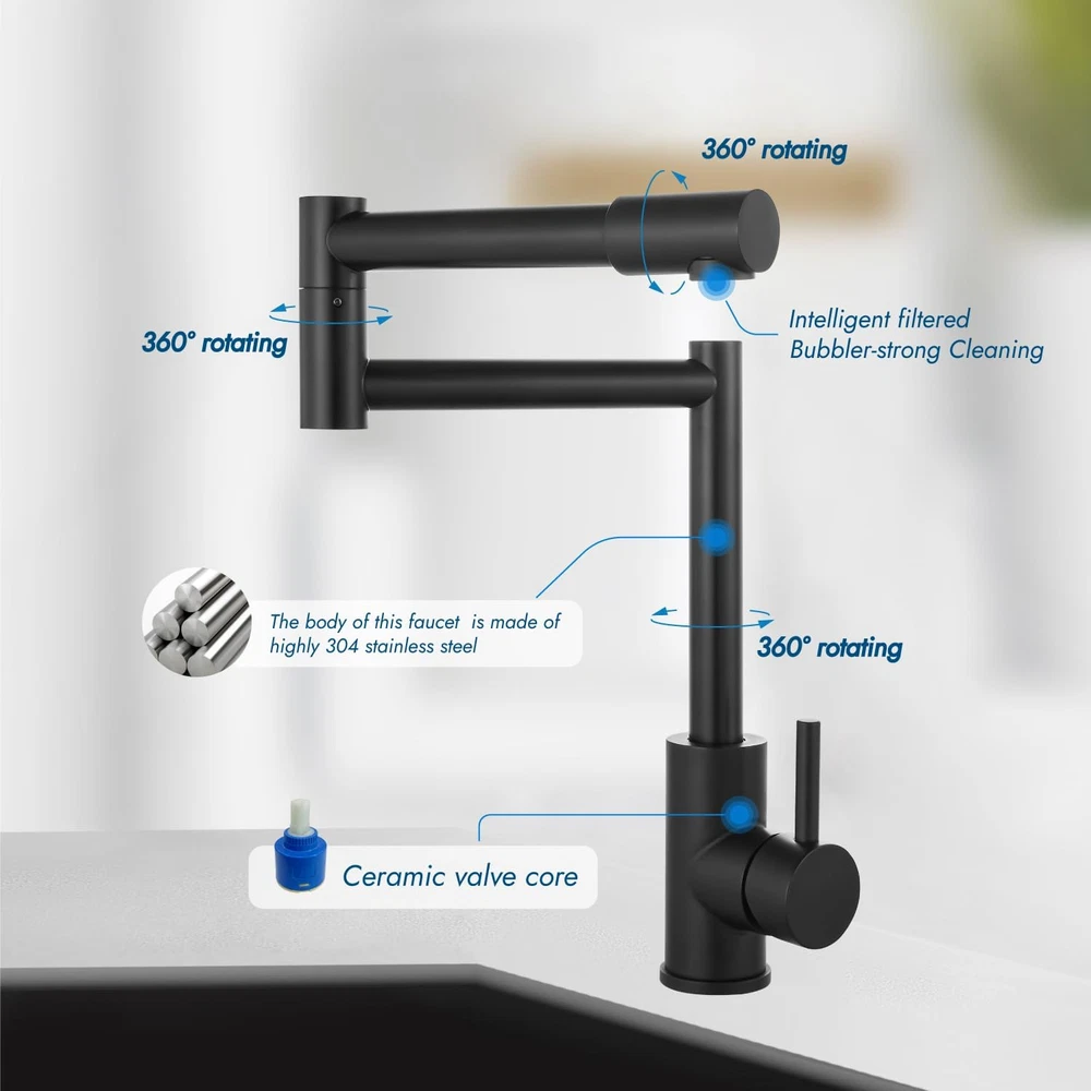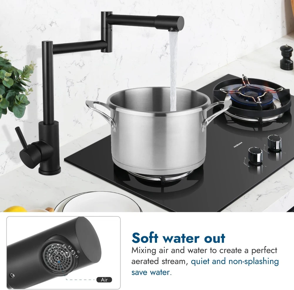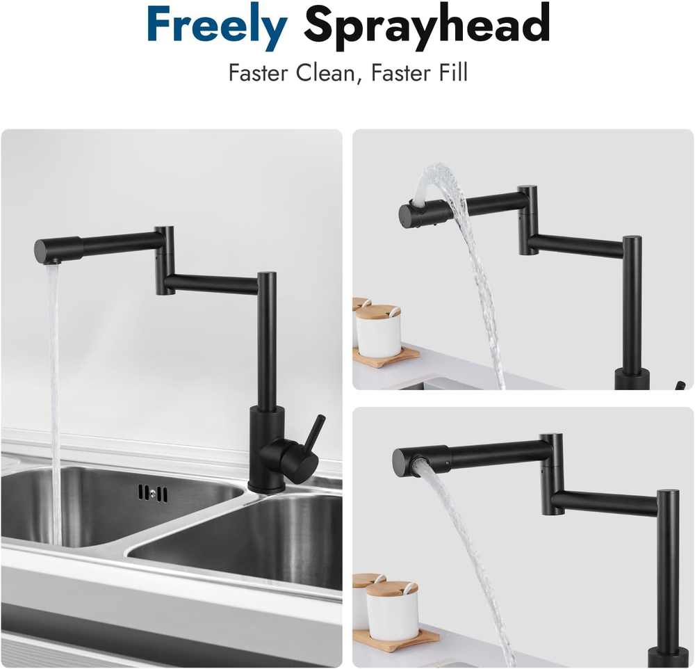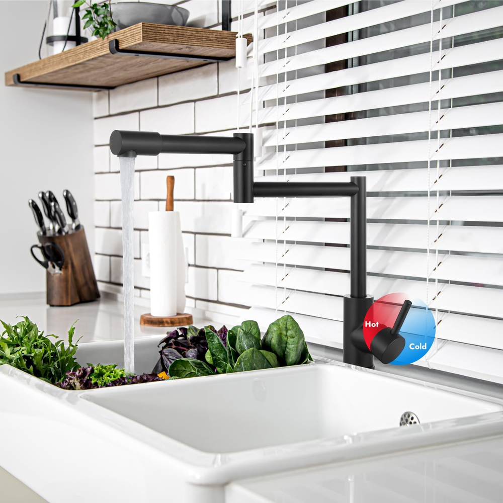 This pot filler faucet is a game-changer in the kitchen! The 360° rotating design makes filling pots so much easier, and the matte black finish adds a sleek, modern touch. The single handle controls hot and cold water smoothly, and the retractable feature is super convenient. Made of durable stainless steel, it feels sturdy and well-built. Installation was straightforward, and the water flow is strong yet efficient. Perfect for any home chef looking to upgrade their cooking space!