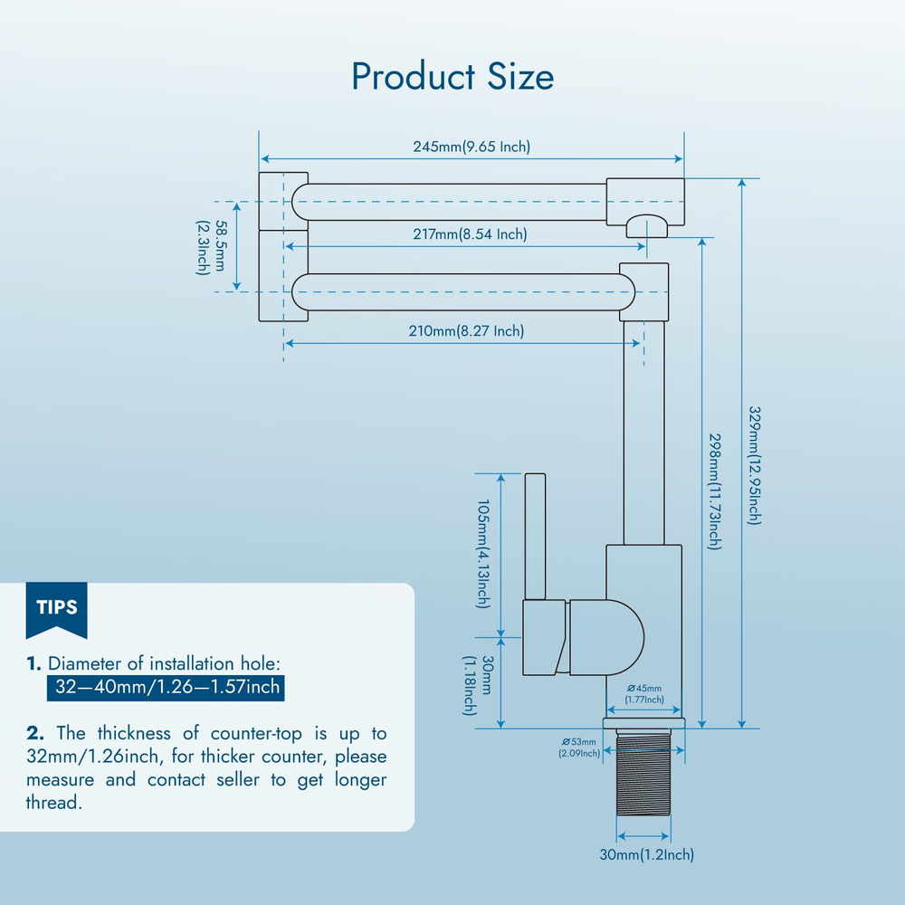 Store New Arrivals Add to Favorite View Feedback Contact Deck Mounted Pot Filler Faucet Hot and Cold Water Single Handle Countertop Double Joints 360° Rotating Retractable Commercial Kitchen Sink Faucet Stainless Steel, Matte Black Description Item model number B095CKNVV2 Hole Count 1 Is Electric No Maximum Flow Rate 1.78 Gallons Per Minute Batteries Included? No Batteries Required? No Finish Matte Black Product Dimensions 15.35 x 10.62 x 2.95 inches Material Stainless Steel Installation Type Counter Mounted Finish Type Matte Black Item Package Quantity 1 Number of Handles 1 Item Weight 5.57 pounds Special Features 360 Swivel Special Feature 360 Swivel Part Number B095CKNVV2 Mounting Type Deck Mount Color Matte Black Recommended Uses For Product Kitchen Included Components Handle Handle Type 1 Handle 【Premium Quality】Flow rate:1.78GPM 8.09 L/min. The core material of this kitchen sink countertop deck mount pot filler is made of food-grade stainless steel, which increases the durability and reliability of the structure 【Installation size】The diameter of installation of hole should be 32mm (1.26inch) -40mm(1.57inch). The max countertop thickness is 32mm (1.26inch). Please pay attention to whether the size is suitable for the hole size in your home before buying 【Hot and Cold Water】Cinwiny kitchen sink stainless steel countertop deck mount pot filler use one single handle to control cold and hot water, one hole counter mounted, dual swing joints that can rotate 360 degrees, dual valve control has greater flexibility when used Simple single handle pot filler with ceramic valve provide smooth turning action and prevent dripping. 【Design and Workmanship】The surface of the plating layer has anti-scratch and anti-corrosion properties and is not easy to oxidize. Equipped with exquisite aerator, it can provide stable pressure and straight constant water flow. It's a combination of traditional touch on kitchen sink faucet and pot filler faucet, unique genuine design. 【What’s Include】Counter mount pot filler body, water hose,washers, thread and all needed hardware Product Description Cinwiny Pot Filler Faucet Matte Black Deck Mounted Single Handle Double Joints Free Rotating Modern Deck Mounted Countertop Retractable Product Specification Material : 304 stainless steel Style: Modern Finish : High Quality Matte Black Design:NPT 1/2" connecting thread, fit for US standard, with a installation flange for stability ABOUT US We offer the best prices around on high quality products. Our E-store includes media such as books, movies, music and games while offering electronics, toys, sporting apparel, clothing, tools, general home, garden items and more. SHIPPING We are always working hard to ensure your package arrives as soon as possible. Please understand that some factors like weather, high postal traffic, and the performance of shipping companies are outside of our control. We offer free shipping to the lower 48 states and ship within 2 business days of payment, usually sooner. We do not accept P.O. Boxes. Please provide a physical address. For shipping outside of the continental USA, we only use eBay's Global Shipping Program.The item is shipped to KY and then sent to the rest of the world. International customers are responsible for all duties and taxes. Continue to check out in order to calculate costs for shipping the item to your country. Messages regarding eBay's Global Shipping Program MUST be directed at eBay EXCLUSIVELY. RETURNS We offer a 30-Day Return Policy on items which you are not completely satisfied with. You have the option for a full-refund or an exchange of the item. No returns are available on items shipped outside of the USA. PAYMENT We accept PayPal. CONTACT US This page content is yet to come Please ad us to your favorite seller and visit again later Thank You CUSTOMER SATISFACTION We try our very best to make sure every customer is completely satisfied. If there's a problem, message us! We're happy to help. WE ACCEPT Copyright © 2021 AutoDS. | All Rights Reserved