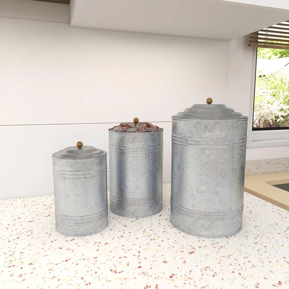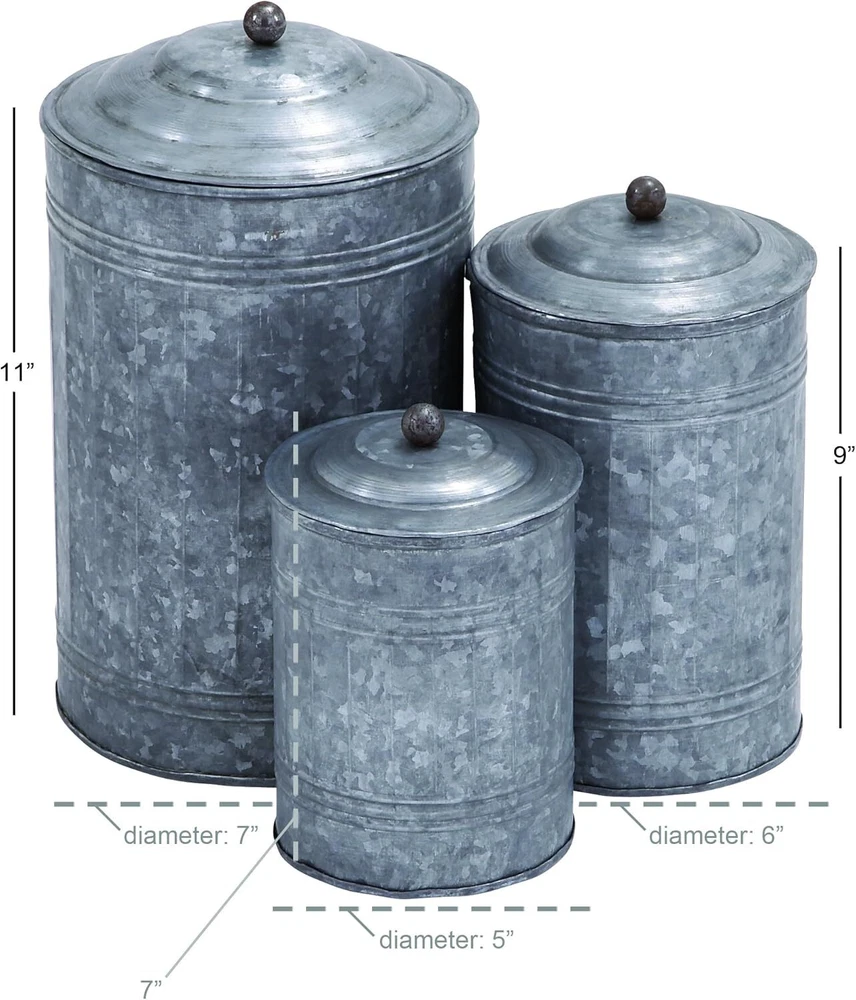 Deco 79 Metal Living Room Decorative Jars Galvanized Ribbed Gray Product Details Finish Type: Galvanized Unit Count: 1.0 Count Capacity: 460 Cubic Inches Manufacturer: Deco 79 Product Dimensions: 7 x 7 x 11.95 inches Item Weight: 4 pounds Item model number: IR 23257 Is Discontinued By Manufacturer: No Finish types: Galvanized Dishwasher compatible: No Assembly required: No Number of pieces: 1 Batteries required: No Included Components: Decorative Jars Color: Gray Material: Iron Product Dimensions: 7"L x 7"W x 11.95"H Item Weight: 4 Pounds Brand: Deco 79 Rustic texture and old age look Both decorative and functional It is food safe Set of three 11", 9" and 7" farmhouse rustic galvanized iron round canisters, hammered finish with subtle fence-ribbed sides and oxidized black ball-capped lids. Vintage style metal canisters with lids feature a galvanized finish. Use chalk-like markers to note the contents of the jars. Suitable to use as a decorative item. Best for both indoor and outdoor use.