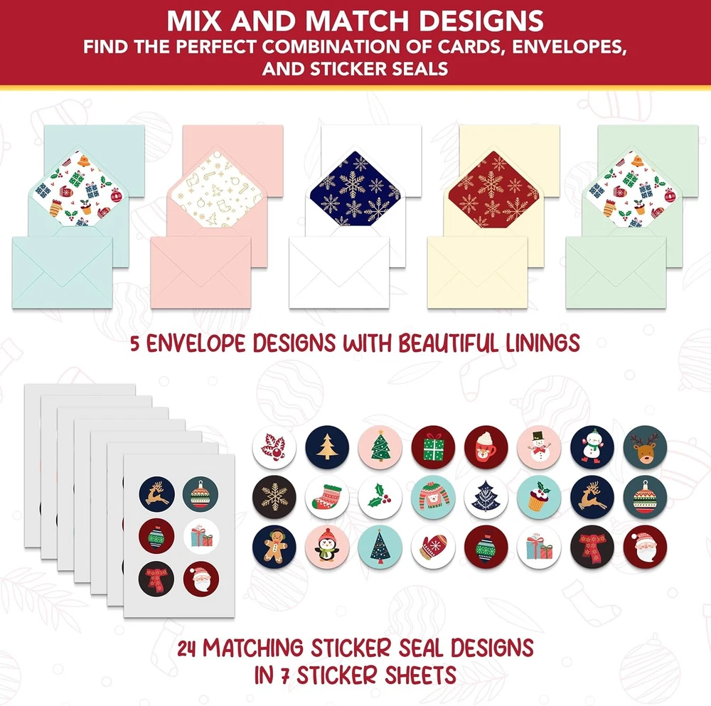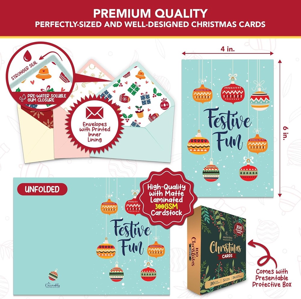 Free eBay listing template designed by dewiso.com Decorably 100 Pack Foiled and Glittery 6x4in Christmas Cards with Envelopes Bulk and Stickers, 20 Festive Designs Bulk Christmas Cards with Envelopes, with Printed Message Inside FREE AND FAST SHIPPING! SPREAD THE MAGIC OF THE SEASON - Share the joy and love with these boxed Christmas cards bulk, more than enough to share the festive spirit with everyone on your list. Bring a smile to their faces with these assorted holiday cards bulk! COMPLETE PACKAGE - Mix and match these holiday cards with envelopes and stickers. It includes 100 Christmas cards in 20 designs, 100 envelopes with pre-water soluble gum closure in 5 designs & printed linings and 105 matching stickers in 24 designs. WARM CHRISTMAS WISHES INSIDE - Each Christmas card in this boxed Christmas cards comes with a heartfelt printed message inside, ready to share holiday cheer. Spread the festivity and joy with these thoughtful Christmas cards boxed with envelopes. SHIMMER & SHINE CARD PRINTS - Light up the season with these cards Christmas with envelopes, featuring delightful designs from elegant foil to sparkling glitter print. These elegant 100 pack bulk Christmas cards spread joy and bring happiness to all. WE JUST WANNA MAKE YOU SMILE - Your happiness is our unwavering priority. If you ever find yourself less than delighted with your holiday cards with envelopes, simply reach out, and it will be made right. Buy with confidence and don't miss out on these well-designed Christmas cards! Product We offer a 30-Day Return Policy on items which you are not completely satisfied with. You have the option for a full-refund or an exchange of the item. No returns are available on items shipped outside of the US . Shipping We offer Free Shipping to the US and ship within 2 business days of payment, usually sooner. We use UPS express shipping. That's why your products are usually delivered within 3 days . Contact We try our very best to make sure every customer is completely satisfied. If there's a problem , message us! We're happy to help. 24/7 live chat available.