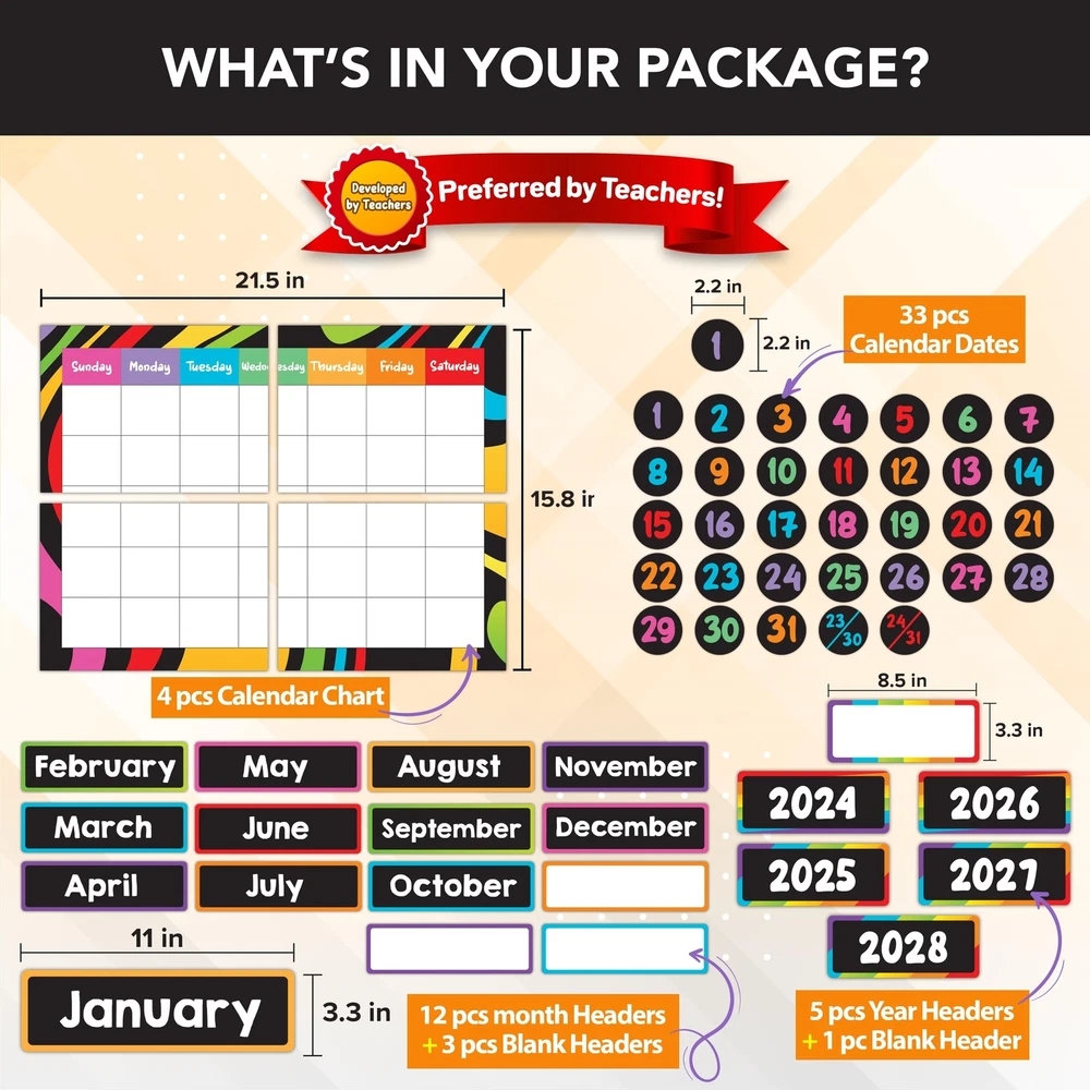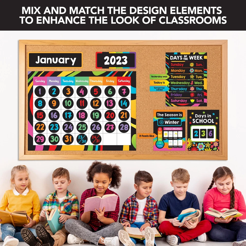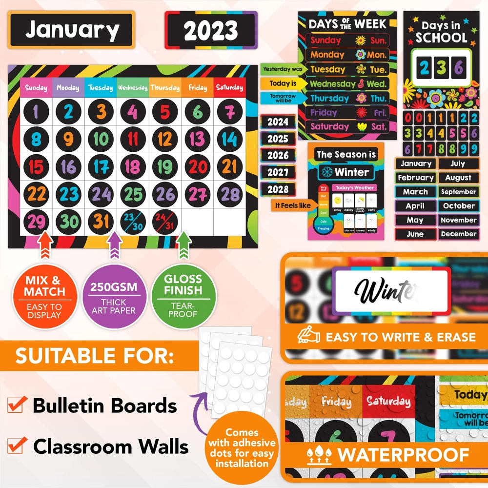 CALENDAR BULLETIN BOARD SET - Brighten up classrooms with days of the week poster for kids. This set includes a 4-piece calendar chart that is fun to assemble. It comes with 143 colorful cutouts that transform classrooms into a lively space! PLAY & LEARN - Teach them about dates, seasons, and events while creating an engaging learning environment with this wall calendar for classroom. Elevate students' learning space with this well-designed calendar school classroom calendar set. DESIGNED TO LAST - Experience the convenience of this pre-cut and sturdy classroom calander set. Crafted from high-quality gloss-laminated paper for easy writing & erasing, Elevate your classroom décor with this class calendar bulletin board set. IMPROVE LEARNING - Teach a sense of time and responsibility to students with this bulletin board calendar set for classroom. This will help students with topics like counting days, keeping track of major occasions, and celebrating birthdays. WE JUST WANNA MAKE YOU SMILE - Your happiness is our unwavering priority. If you ever find yourself less than delighted with your chalkboard preschool classroom calendar set & calendar for school classroom calendar, simply reach out, and it will be made right. Buy with confidence and don't miss out on this well-designed calendar for kindergarten classroom!