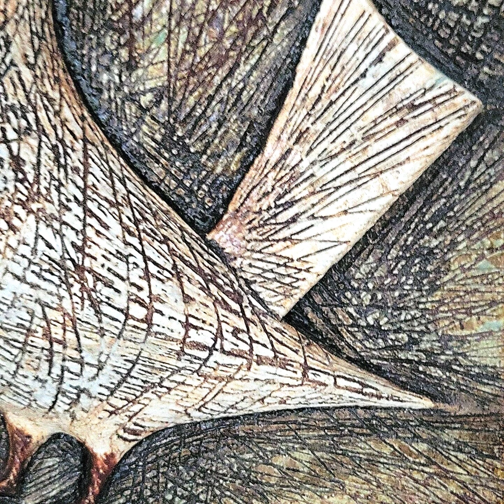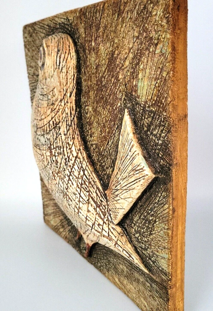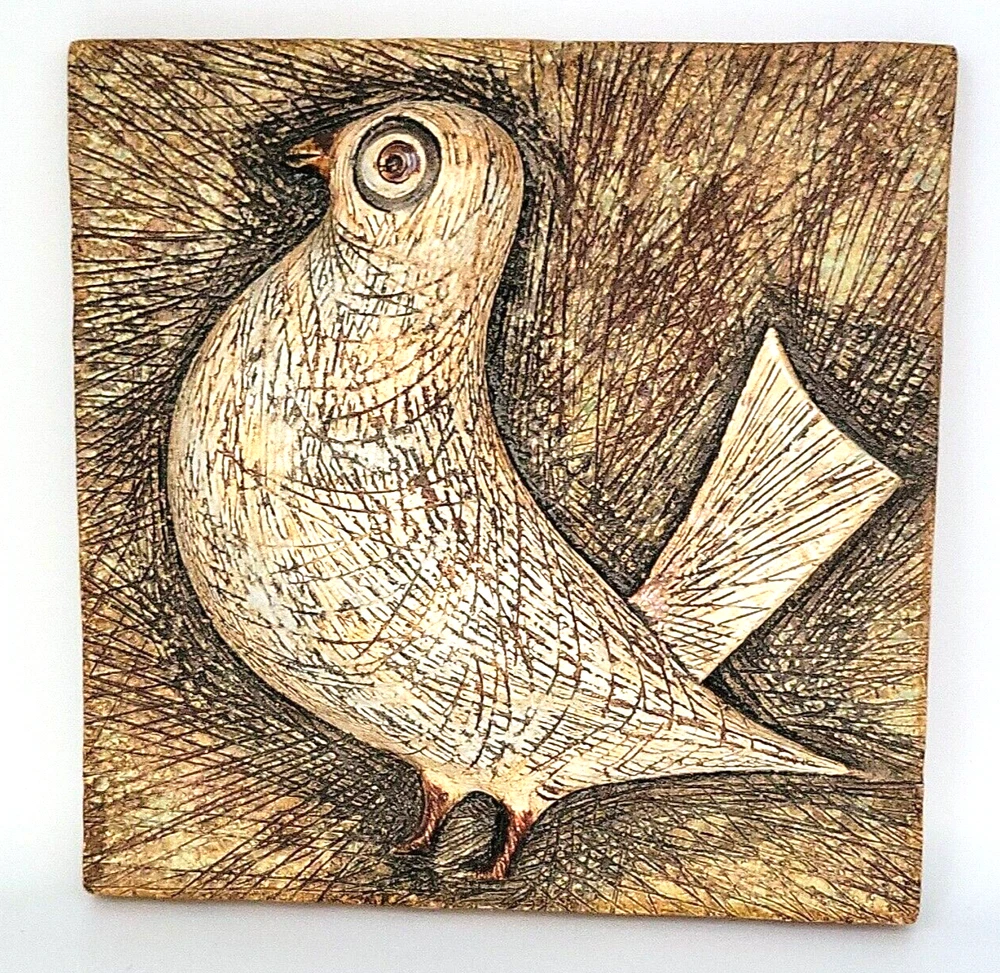Decorative Ceramic Textured Glazed WallPlaque Tile W/3D Raised Dove/Pigeon Bird. This is a gorgeous wall tile. It has a raised bird that appears to be a pigeon or a dove. The entired piece has a scratched line texture to it, even on the bird (see photos). It is glazed with hues of brown and cream with a little bit of greenish glaze (see photos). It is not signed, but it does have the numbers 324 on the back. There is a indent on the back that for hanging on a wall (see photos). This piece measures about 9.75" square and is about .50" thick. There are no chips on this piece. It is a heavy piece weighting over 5 lbs. I will ship this item within 1 day of a receive payment. If purchased on the weekend it will ship out on Monday.