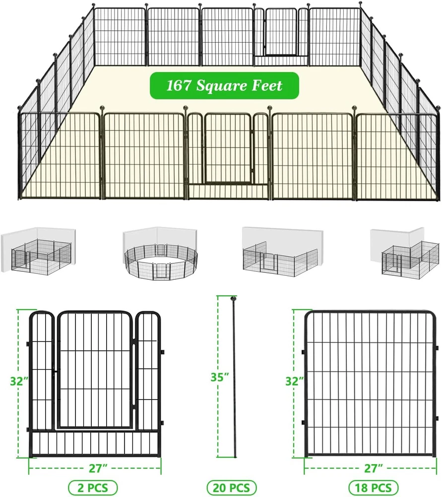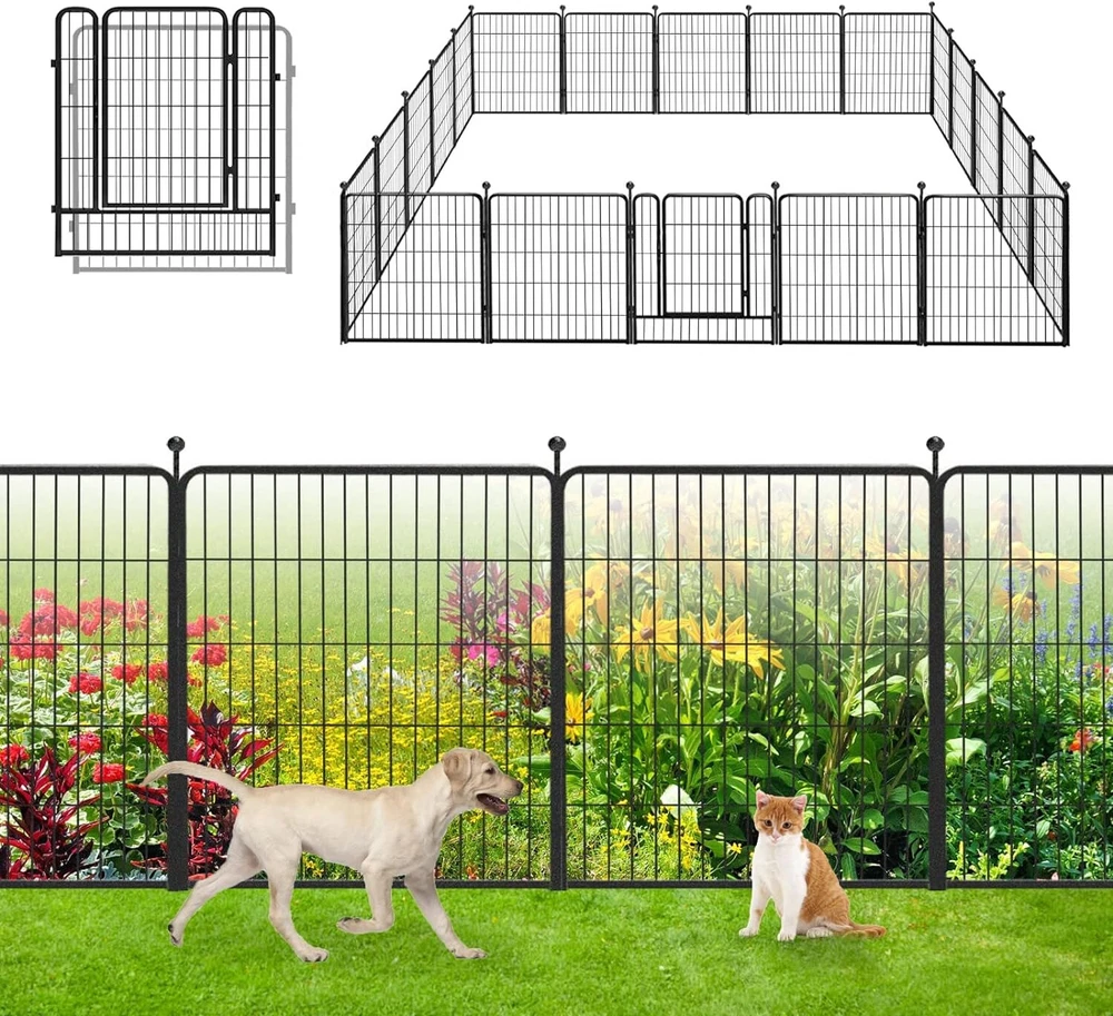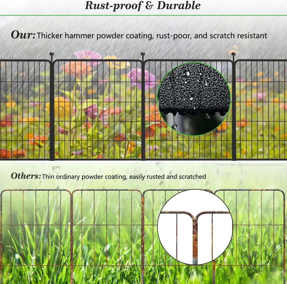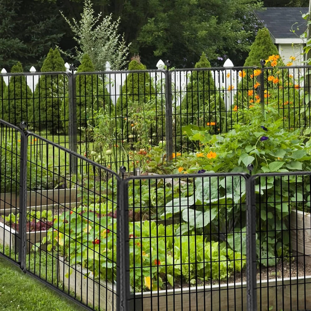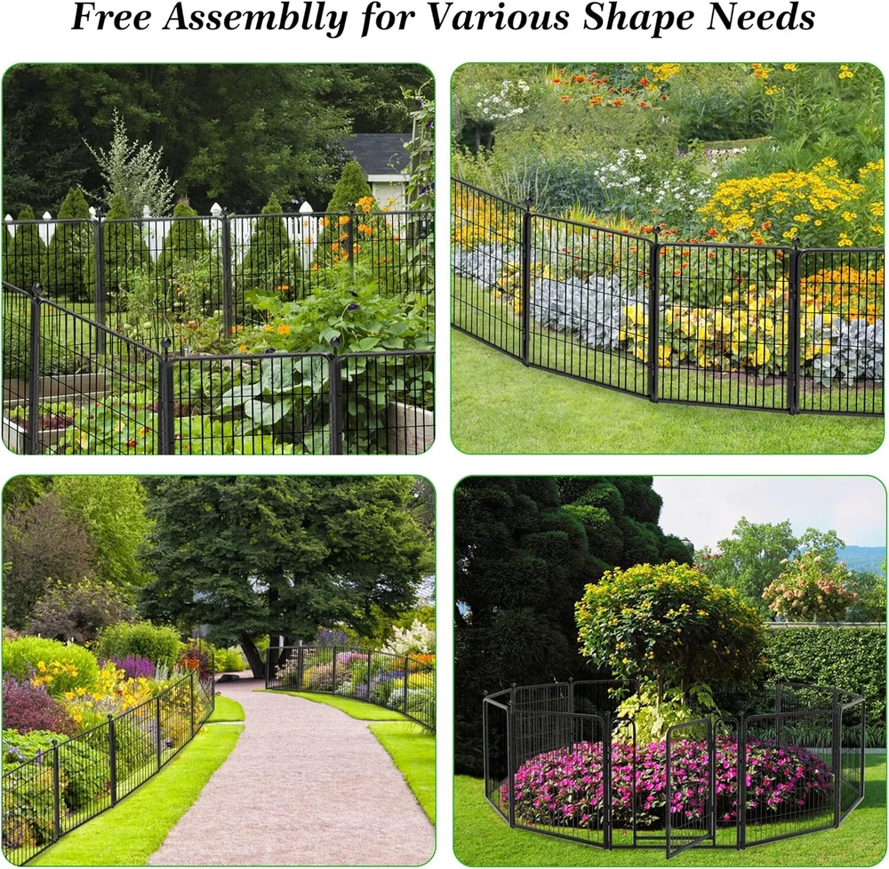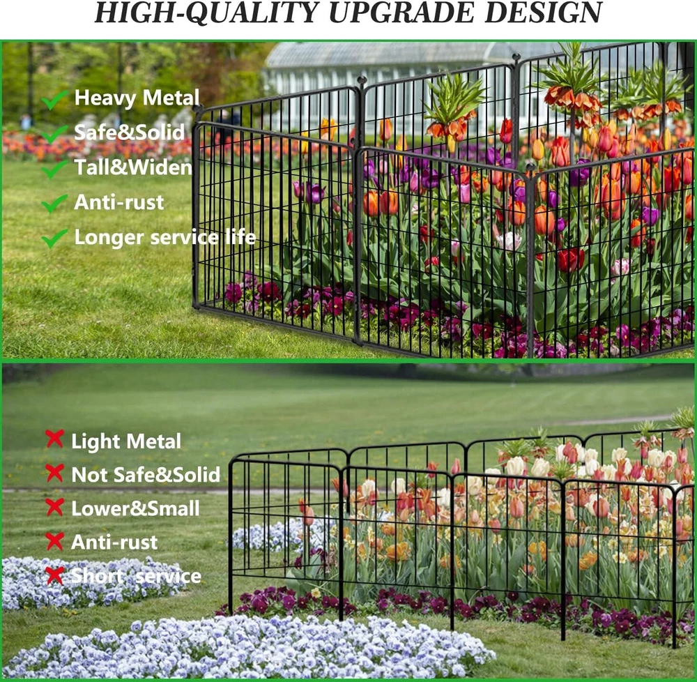 【Easy to Assemble】: This garden fencing is easy to assemble. Combine two panels and insert an iron rod through the hole. It can be set up into round, rectangle, "L" or other shapes according to your needs. 【Upgrade Design】: The upgraded ball pole head design is easy to install and safer; more layers of welded metal wire design, no dig fence for dogs, protecting your plants from small animals, and better growth. 【Size】: The panels are available in 32"H, 46ft L sizes, ideal for indoor and outdoor use, in gardens, patios, yards, and RV camping, among other locations. 【Rust-proof】: Garden edging border with a double powder coated finish to prevent rustproof. The Metal panels are made of heavy duty iron, and thick wire welded. Visually, our fence will not interfere with your enjoyment of your garden. The fence panels are sturdy, for outdoor use. 【Multiple Applications】: This folding garden fence can uses as decorative garden fences, christmas tree fences, flower bed fences, garden fencing animal barrier, outdoor garden fence, temporary fence, landscape fencing garden, no dig fence, it can be modified into a dog fence for the yard! Product Description The Beautify Decorative Garden Fence Border Flower Bed Fencing for the Yard Garden Landscape Edging Metal Wire Fence keeps dogs or critters away from your plants and provides an extra barrier for your flower and vegetable beds. This garden fence has a stylish and minimalist design that will not interfere with your enjoyment of your plants and flowers. Modern Ideal Design - Dog Fence for the Yard Temporary Garden Fencing - You can really enjoy your life without worrying about the dogs running away. - 32" High-quality metal dog playpen puppy pet fence is suitable for small/medium/large dogs to play outdoors and indoors. - The flower bed border fence includes a garden door, which creates practical access for you can freely access the garden. Garden Fencing 32 inch High Fence - Suitable For All Weather The high-quality double-coating process makes the fence waterproof and gives it a longer life outside. Easy Setup Style - Use the fencing in different scenarios 10~64 panels fence set, you can choose according to your actual needs, this fence can be installed and removed anytime and anywhere. Q: Can this fence be used as a pet barrier? A: Yes! These garden fences are available for 10" to 32" size animals, which can block the entry of from 2lbs to 50lbs dogs, rabbits, or other animals. Q: How wide is the temporary fence? Can I expand the border fence? A: This patio fence is 27.5 inches wide, 32 inches in height, a total length of 22~147ft, and 10~64 panels for your choice! You can add more panels to expand a larger space to meet your needs. Q: Can I put more than one set together? A: Yes! Each side is a male and female connection, you could add as many as you want. And we have separate panels and poles, you can purchase them to expand the dog fence to meet your needs. Add to Cart Add to Cart Add to Cart Customer Reviews 4.8 out of 5 stars 62 4.8 out of 5 stars 62 1.0 out of 5 stars 1 4.8 out of 5 stars 62 Price $139.99 $ 139 . 99 $249.99 $ 249 . 99 — $489.99 $ 489 . 99 Panels 8 Panels 16 Panels 24 Panels 32 Panels Included Components 8PCS(7 Panels+1 Gate+8Rods) 16PCS(14 Panels+2 Gate+16Rods) 24PCS(21 Panels+3 Gate+24Rods) 32PCS(28 Panels+4 Gate+32Rods)
