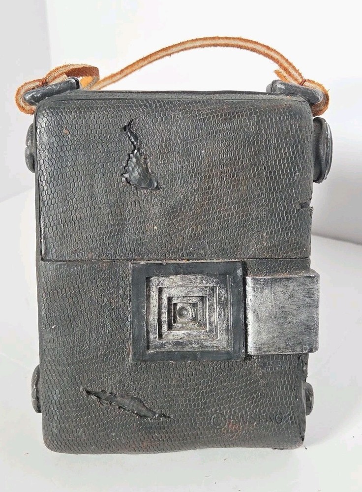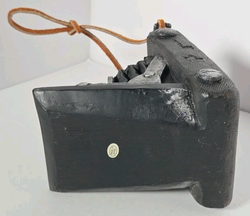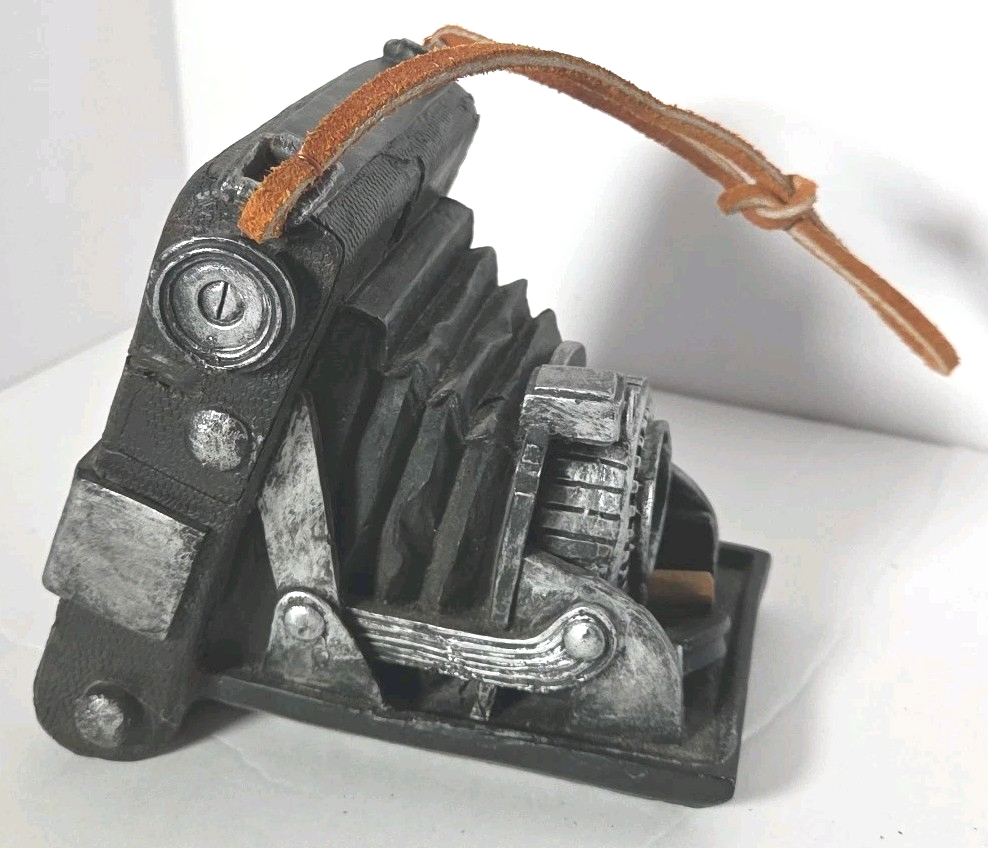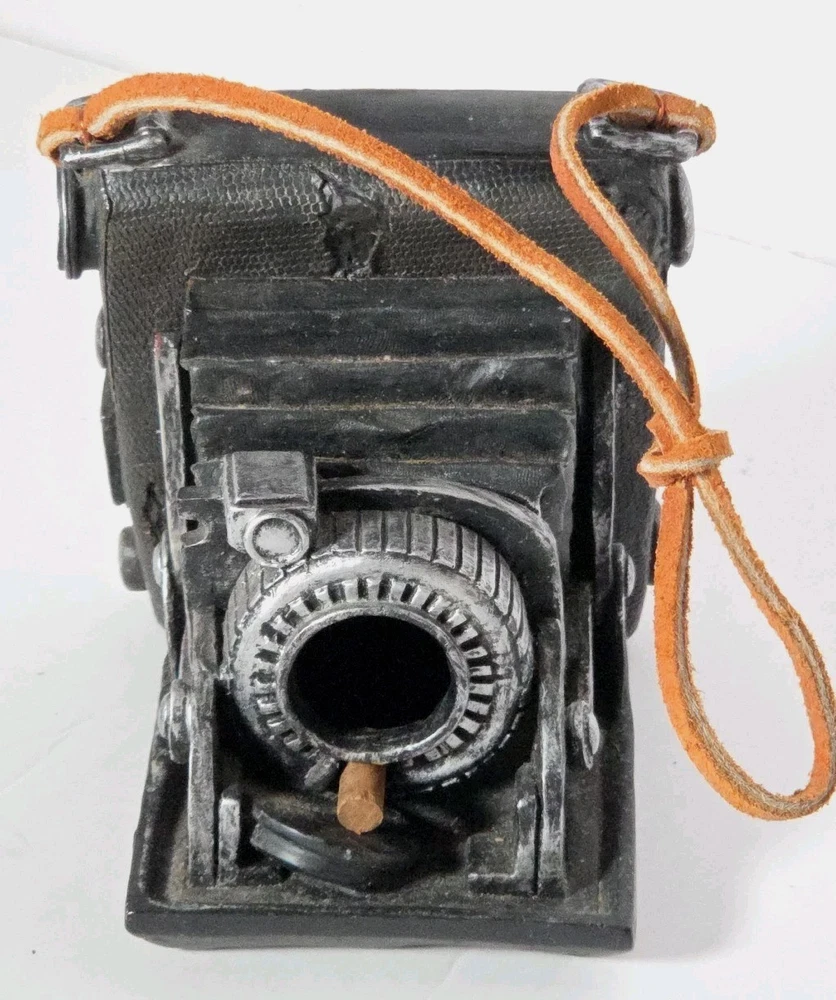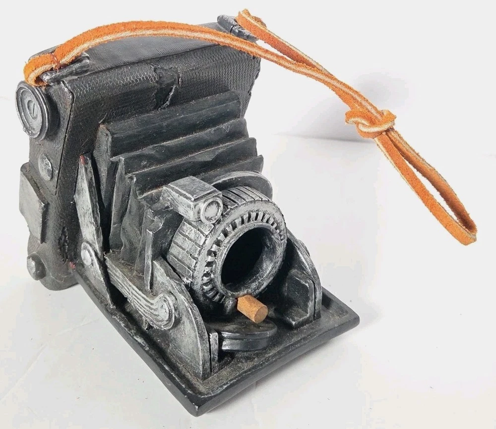 This decorative old fashioned folding camera replica is made of resin with a leather strap, standing at approximately 5 inches tall. Its classic design and black color give it a timeless appeal, perfect for adding a touch of nostalgia to any collection or decor. This unique piece combines the old-fashioned style with modern materials, making it a versatile and eye-catching addition to any space. Made in China, this one-of-a-kind item is sure to stand out in any collection of decorative items.