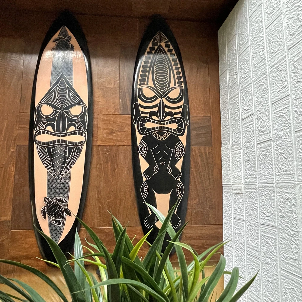 Perfect Size: Measuring 39 inches long, 9 inches wide, and 0.5 inches thick, these surfboards are ideal for displaying on walls, enhancing your living space. Hand-Carved Design: Each surfboard features intricate tiki mask carvings, crafted from wood for a unique, tropical look that enhances your home decor. Vibrant Colors: Predominantly black with natural brown accents, these surfboards make a bold statement and add island charm to any room. Easy to Mount: Equipped with screw-attached D-rings, these surfboards are quick and hassle-free to install with hooks or screws (not included). Versatile Decor: Ideal for living rooms, kitchens, bedrooms, or tiki bars, these surfboards bring a tropical seaside atmosphere into your home. Our eBay Store About Us Add to Favorite Sellers Decorative Set of 2 Wall-Hanging Surfboards – Hand-Carved Wood with Tiki Mask Designs – Black with Natural Brown Accents – 39 inches Long – Tropical Island Inspired Wall Art Perfect Size: Measuring 39 inches long, 9 inches wide, and 0.5 inches thick, these surfboards are ideal for displaying on walls, enhancing your living space. Hand-Carved Design: Each surfboard features intricate tiki mask carvings, crafted from wood for a unique, tropical look that enhances your home decor. Vibrant Colors: Predominantly black with natural brown accents, these surfboards make a bold statement and add island charm to any room. Easy to Mount: Equipped with screw-attached D-rings, these surfboards are quick and hassle-free to install with hooks or screws (not included). Versatile Decor: Ideal for living rooms, kitchens, bedrooms, or tiki bars, these surfboards bring a tropical seaside atmosphere into your home. Elevate your home decor with this stunning set of two decorative wall-hanging surfboards, bringing a touch of island charm to any space. Hand-carved from wood, these surfboards feature intricate tiki mask designs, offering a captivating tropical vibe. The boards are predominantly black with natural brown accents, creating a striking contrast that enhances their visual appeal. The glossy finish adds a sleek touch, making the design stand out beautifully. Each surfboard measures approximately 39 inches long, 9 inches wide, and 0.5 inches thick, with slight variations due to the unique hand-carved craftsmanship. These surfboards are not only decorative but also versatile, ideal for a variety of settings in your home. Mount them effortlessly using the screw-attached D-ring on the back of each board, allowing for quick installation with screws or hooks (not included). Whether displayed in the living room, dining room, kitchen, bathroom, bedroom, or tiki bar, these surfboards bring a serene, tropical atmosphere into your living space. With their handcrafted details and timeless design, these surfboards are a perfect way to transform your walls into captivating works of art. Product Details Color Multicolored Height 0.5 Length 39 Weight 3.45 LB