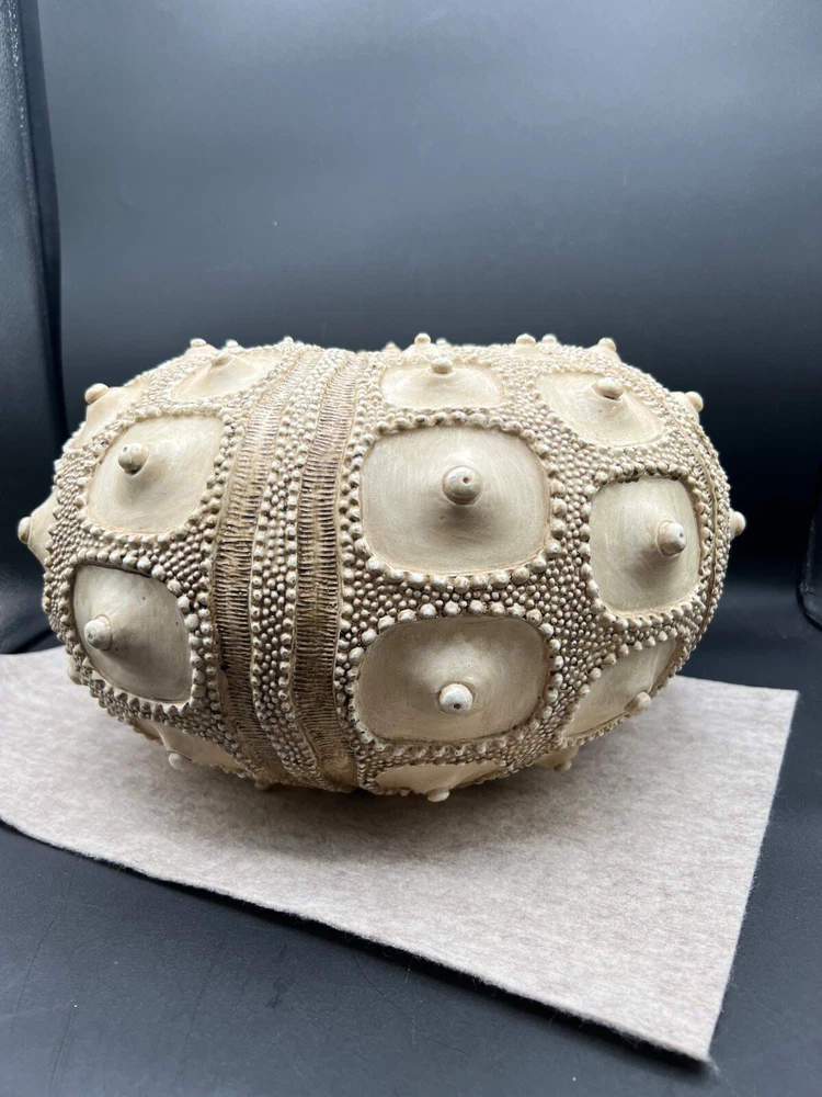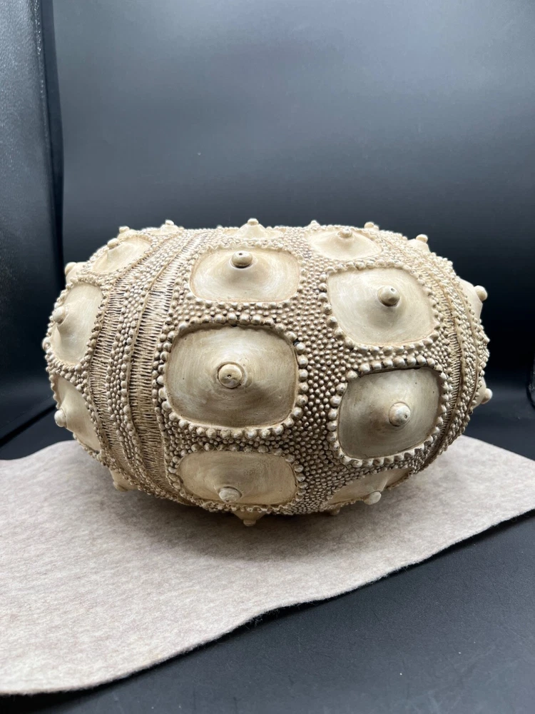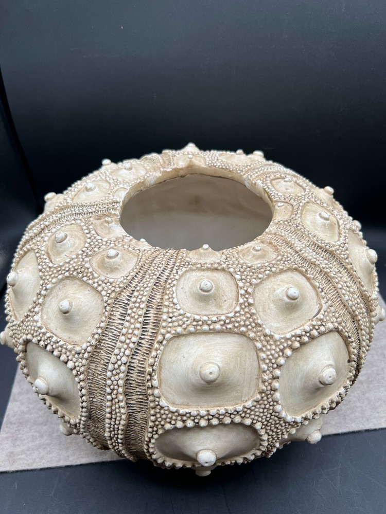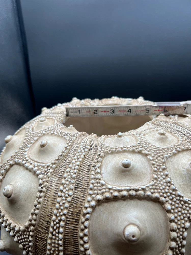 This decorative vase is designed in the shape of a sea urchin, making it a unique and eye-catching addition to any space. The large size and beige color add a touch of elegance, while the resin material gives it a sturdy and high-quality feel. Perfect for showcasing seashells or other decor items, this vase combines artistic flair with a beachy aesthetic, making it a perfect choice for coastal or beach-themed home decor.
