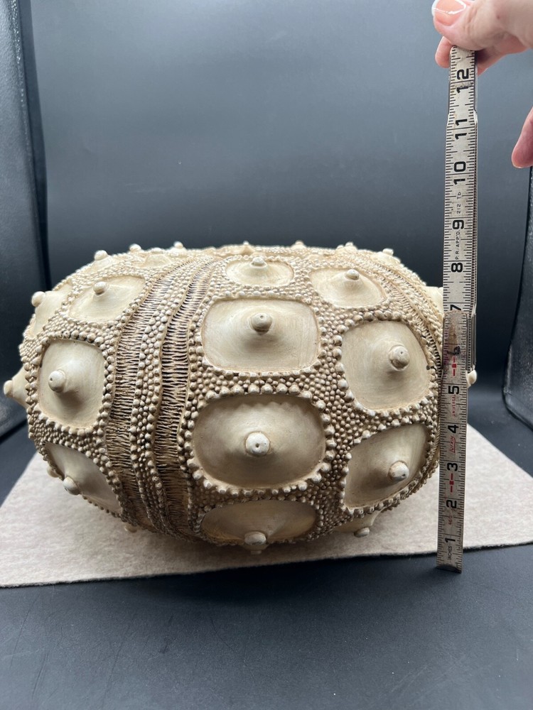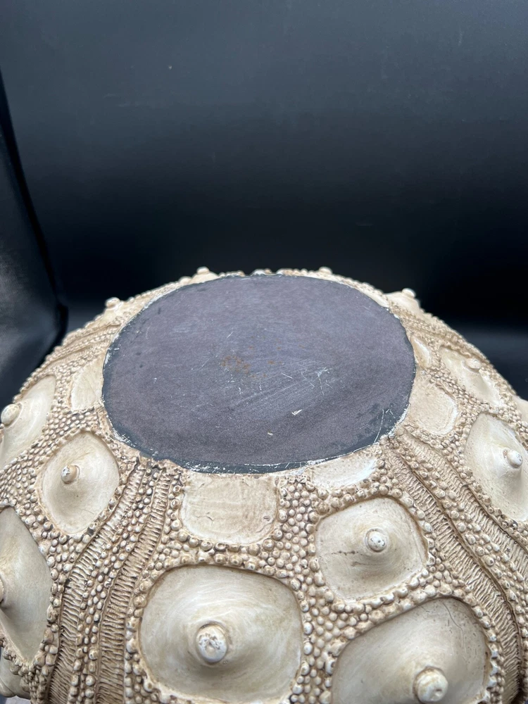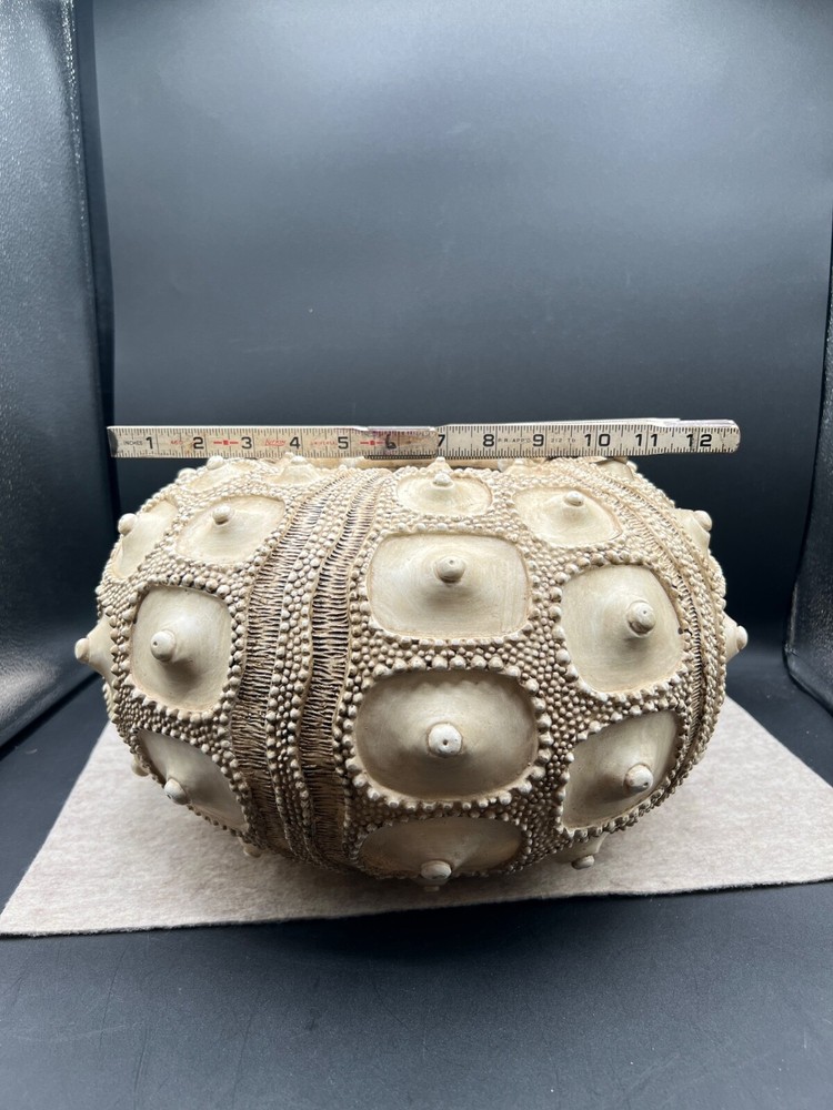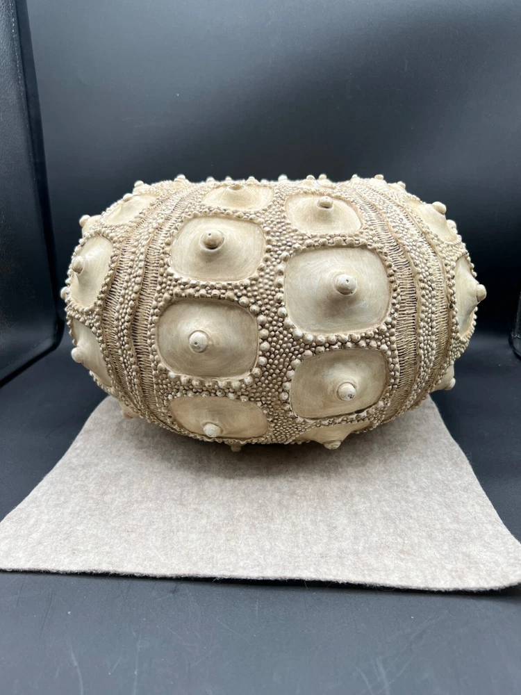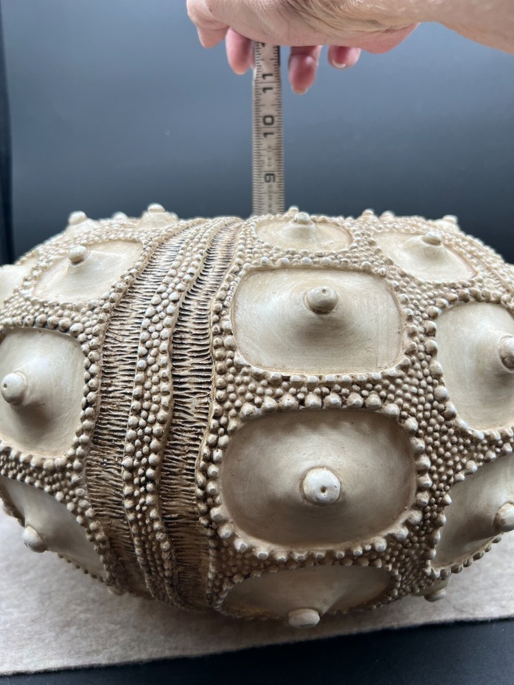 This decorative vase is designed in the shape of a sea urchin, making it a unique and eye-catching addition to any space. The large size and beige color add a touch of elegance, while the resin material gives it a sturdy and high-quality feel. Perfect for showcasing seashells or other decor items, this vase combines artistic flair with a beachy aesthetic, making it a perfect choice for coastal or beach-themed home decor.