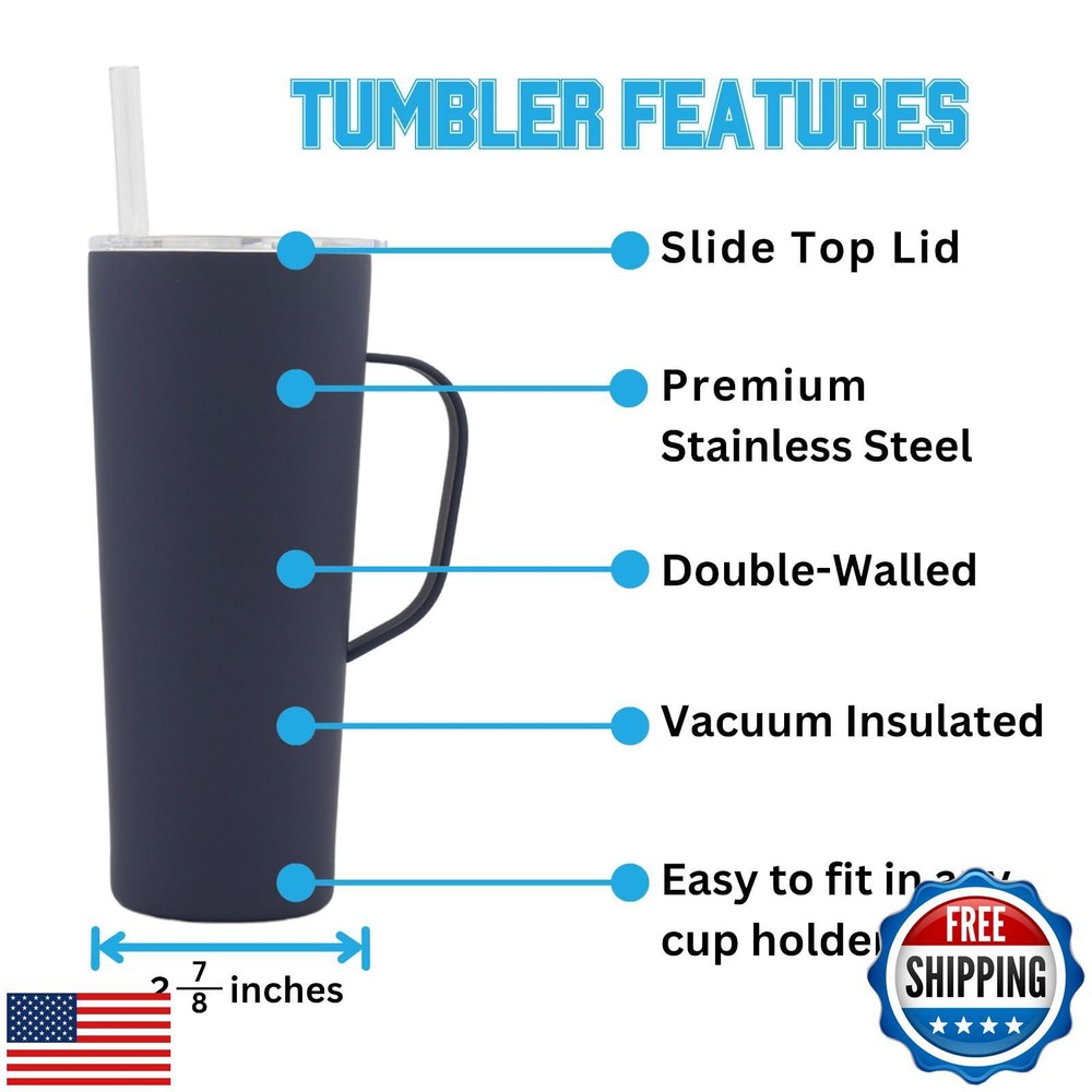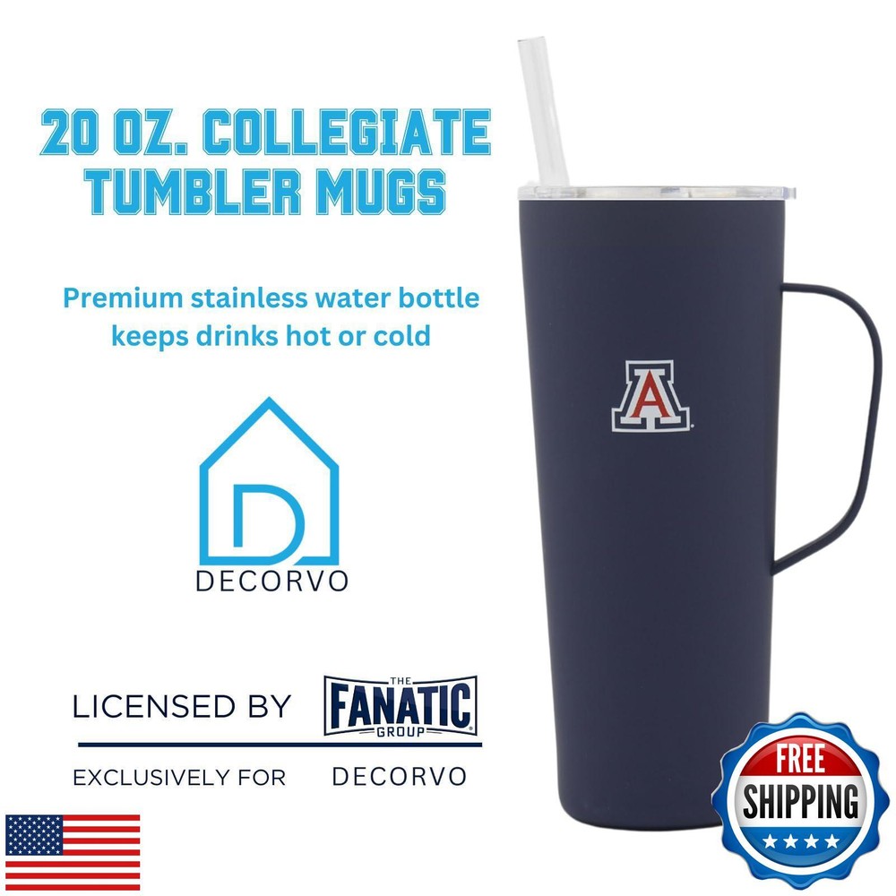 Decorvo NCAA 20 oz. Stainless Steel Tumbler with Handle - Officially Licensed Double Walled Insulated Roadie with Slide Lid and Straw (Arizona Logo - Navy) Features College Pride - show your college pride for your alma mater ith this collegiate 20 oz travel mug. The double walled stainless steel allows for dual purpose use of this tumbler, either for hot coffee or use as a cold water bottle Cup Holder Friendly - this officially licensed tumbler with a 3 inch wide bottom fits nicely into your cup holder whether you are going to the stadium, to school or to work Slide-Top Lid and Straw - whether you want to chug your drink with the easy to slide lid or with the included straw, this artisticly designed mug is the perfect gift Variety of Styles - with several different colors and styles to choose from, these stainless steel tumbler drinkware will match perfectly with any of your college gear Care Instructions - Hand wash only Shipping Free & Fast Shipping: We offer free shipping to most of the USA with a normal delivery time of 3-7 days. However, due to the current situation, additional delivery time (up to 3 weeks) may be required for some items. Alternative Carriers: We may use alternative carriers (e.g., USPS, FedEx, UPS) to ensure your package arrives safely and on time. Due to the use of multiple carriers, we are unable to provide a tracking number automatically. Handling Time: Orders are processed and shipped within 1-2 business days of receiving cleared payment. Shipping Restrictions: Shipping to Alaska, Hawaii, Puerto Rico, Guam, and other US territories may incur shipping charges or delivery restrictions. Please contact us before ordering, or your order can be refunded/cancelled. State Restrictions: Certain items may not be shipped to California due to state regulations. Contact for Tracking Updates: If you require tracking updates or have any concerns about the delivery of your order, please feel free to contact us, and we will be happy to assist you. Return Policy 30-Day Hassle-Free Returns: If you are not completely satisfied with your purchase, you can return the item for free within 30 days of receiving it for a full refund or exchange. Easy Return Process: Contact us, and we will provide you with a prepaid return shipping label and detailed instructions. No Restocking Fee: There are no restocking fees for returns. However, the buyer is responsible for return shipping costs if the return is not due to a seller's error. Refund Processing: Refunds will be processed within 1 business day of receiving the returned item in its original condition. Payment We accept all major credit cards, PayPal, and Apple Pay for your convenience. Your payment information is secure and encrypted to ensure a safe and seamless transaction. Please complete your payment within 3 days of purchase to avoid any delays in shipping. Feedback Your feedback is extremely important to us. We strive to provide the best products and customer service possible. If you are satisfied with your purchase, please take a moment to leave us a positive review. If you have any concerns or issues with your order, please contact us before leaving negative feedback. We are committed to resolving any problems and ensuring your satisfaction. Contact Us If you have any questions or concerns, please feel free to reach out to our customer support team. You can contact us through the eBay messaging system. We are available Monday to Friday, 9:00 am to 5:00 pm EST, and we will do our best to respond to your inquiry within 24 hours. Thank you for supporting our small family business!