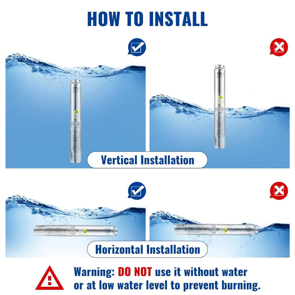 Enhanced Pump Flow & Head: Power: 1.5HP, 115V; Diameter: 4" (for well casing larger than 4''); Discharge: 1-1/4" NPT. This deep well submersible pump is designed with 8-stage thermoplastic impellers, providing 37GPM max flow and 276 ft max head. It comes with an external control box and a 33 ft electric cord, making life without modern plumbing a lot easier. Pump out your worries with ease and relax. No challenge is too big for you. Upgraded Stainless Steel: The whole frame of our deep well pump is unlike anything on the market. It is made of stainless steel, including the outlet and connecting components. You don't have to worry about it becoming rusted or corroded after being underwater for a long time. With ETL certification and IP68 waterproof grade, the pump can be used for 8-10 years. Stop wasting time! The perfect choice is in front of you! Reliable Copper Motor: Are you tired of previous submersible well pumps failing you? Are you ready for consistent satisfaction and quality? The powerful copper motor and high-precision rotor promise long-term stable running. The motor features built-in overload protection, allowing it to automatically stop when stuck or during abnormal situations to prevent burning. NOTICE: DO NOT use it without water or at a low water level to avoid idle running. Trouble-free Check Valve & Filter: This well pump has a built-in check valve to prevent back-flow (an additional check valve is highly recommended). The stainless steel filtration mesh is designed to filter impurities. You can add a layer of gauze in front of the filtration inlet for a new drilled well that may contain excessive granular sediment. Keep impurities out without the headache. Use It Anywhere: Whether you want to solve water supply problems for industry, farmland, or home, this deep water well pump is the one you can trust. It works excellently as a garden water source and sprinkler for the kids. You can use the pump for extracting water from deep wells, reservoirs, canals, rivers, and other water-lifting works. Product Description Enjoy Quick Pumping with VEVOR Deep Well Pump The video showcases the product in use. The video guides you through product setup. The video compares multiple products. The video shows the product being unpacked. Are you worried about the water supply for your family or farmland? Well, get ready to have your well up and running again in no time! Our deep well submersible pump provides a large flow and high head lift, meeting all your water needs. Pump it up today with our submersible well pump! 1 Large Flow 2 High Head 3 Premium Quality 4 Reliable Details 1 Vertical Installation 2 Horizontal Installation 1 Well Pumping 2 Farm Irrigation 3 Domestic Water 4 Livestock Water How long is the electrical cable that comes with the pump? 33 ft. Does this deep well pump have the wire splice kit included? Yes. Does this deep well pump require a foot valve or some type of screen on the bottom? This pump has a built-in check valve. However, it is always recommended to install additional check valve(s) on top of the pump and above. Thank you. How many inches of wells does this pump fit? Fits a 4-inch well.