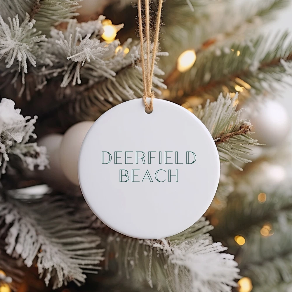 Deerfield Beach Christmas Ornament Christmas Gift Deerfield Beach Gift Deerfield Beach Travel Christmas Decor Deerfield Beach Souvenir Material: Ceramic Color: White Shapes: Circle, star, heart and oval Can be printed on both sides Imprint full-color artwork, photos, or logos Hole for hanging string and hanging string included Printed in the USA