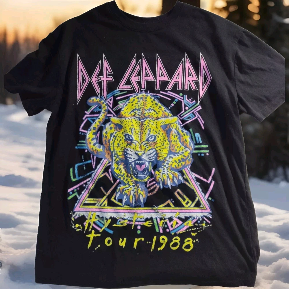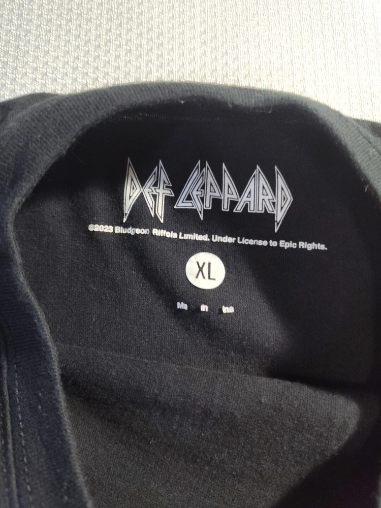 Show off your love for Def Leppard with this official band t-shirt. This black graphic tee features the iconic band logo and is made of comfortable cotton material. The regular fit t-shirt has a crew neckline and short sleeves, making it perfect for any casual occasion. This unisex t-shirt is available in size small and is suitable for both men and women. The Def Leppard band theme adds a touch of rock and roll to your wardrobe. Perfect for concerts, parties, or just hanging out with friends, this t-shirt is a must-have for any fan of the band.