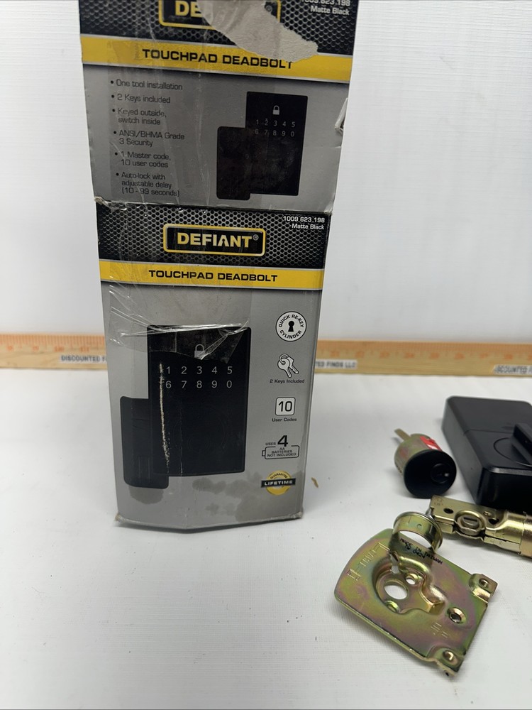 Material: Metal Suitable For: Front Door, Front Entrance Door, Residential Model: 1009 623 198 Country/Region of Manufacture: Taiwan Cross Bore Diameter: 1 in gtin13: 0050134008540 Manufacturer Warranty: None Finish: Matte Number in Pack: 1 Features: Adjustable Backset, Easy to Install, Electronic, With Key Items Included: Hardware, Instructions, Key Style: Modern Type: Touchpad Deadbolt Door Handing: Universal/Reversible MPN: 1009 623 198 Brand: Defiant UPC: 0050134008540 Mounting: Universal Color: Matte Black ANSI Grade: ANSI Grade 3 (Good)