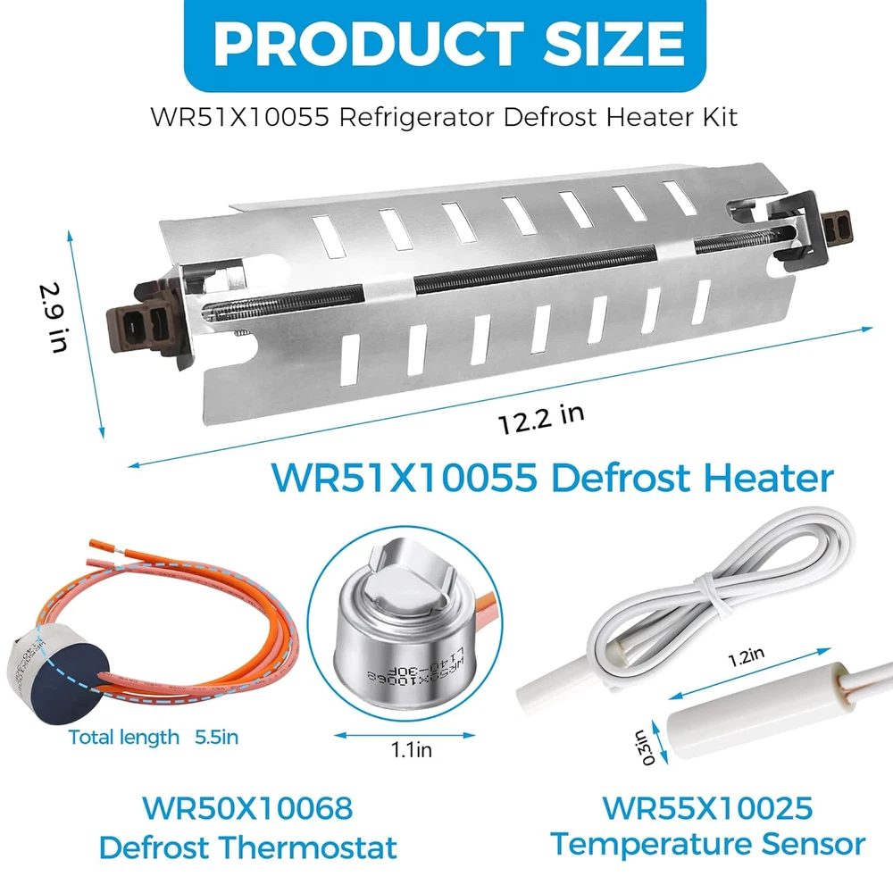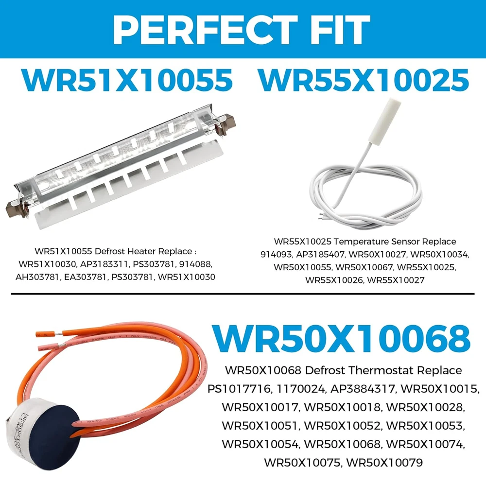 Store New Arrivals Add to Favorite View Feedback Contact "Defrost Heater, Sensor & Thermostat WR51X10055 WR55X10025 WR50X10068 Replacement Set" "Defrost Heater, Sensor & Thermostat WR51X10055 WR55X10025 WR50X10068 Replacement Set" Product Description Product Overview This complete set of defrost components includes the WR51X10055 Defrost Heater, WR55X10025 Temperature Sensor, and WR50X10068 Defrost Thermostat. All parts come in one carton box for convenience, and are designed to replace various compatible part numbers. These high-quality replacement parts ensure your appliance functions efficiently, helping maintain your food's freshness by preventing frost buildup. Easy to install, they offer a long-lasting solution for any refrigeration system. Key Features Complete Defrost Set : Includes the WR51X10055 Defrost Heater, WR55X10025 Temperature Sensor, and WR50X10068 Defrost Thermostat, ensuring a full replacement for your defrost system. Perfect Fit : The WR51X10055 Defrost Heater replaces part numbers WR51X10030, AP3183311, PS303781, 914088, AH303781, EA303781, and others. The WR55X10025 Temperature Sensor replaces multiple part numbers like 914093, AP3185407, and WR50X10027. The WR50X10068 Defrost Thermostat replaces WR50X10015, AP3884317, and many more. Keep Food Fresh & Healthy : The WR51X10055 Defrost Heater melts ice and frost around the coil, preventing buildup and keeping food at optimal storage conditions. The WR55X10025 Sensor reads and sends the current temperature to the control board. The WR50X10068 Thermostat cuts off power to the defrost when the ideal temperature is reached, ensuring safety. Durable & High-Quality : Made from durable materials and well-tested to meet OEM standards, ensuring long-lasting and effective performance for your appliance. Safety First : Always disconnect power before installation, and use work gloves to protect your hands during the process. Possible FAQs What appliances are these parts compatible with? These parts are designed to be used in compatible refrigeration units with specific model numbers, such as freezers and refrigerators. Please check compatibility before purchase. How do I install these parts? To install these parts, you must disconnect the appliance from the power source, remove the defective parts, and replace them with the new ones. Refer to the appliance manual or consult a professional technician for assistance. Are these parts OEM replacements? Yes, these parts are manufactured to meet or exceed OEM standards, ensuring reliable performance and compatibility with your appliance. Why do I need to replace the defrost heater, sensor, and thermostat? These parts are critical for maintaining the proper temperature in your appliance. Over time, they can wear out or fail, leading to frost buildup, which affects the efficiency and health of your food storage. Can I use these parts in any refrigerator or freezer? These parts are designed to replace specific part numbers, so it's important to verify the compatibility with your appliance model. Please check your appliance’s manual or contact the manufacturer for compatibility. What happens if the defrost system fails? A failure in the defrost system can lead to frost buildup around the coils, affecting the appliance's efficiency and potentially causing food to spoil. Replacing faulty parts ensures your appliance functions properly. How do I know if my defrost heater, sensor, or thermostat is faulty? Common signs of failure include frost buildup, improper cooling, or the appliance running constantly. If you notice these issues, replacing the faulty part may resolve the problem. Are the parts tested for quality? Yes, each part is tested for quality and performance before being sold, ensuring that it meets high standards for reliability. Do I need any special tools to install these parts? Basic tools such as screwdrivers may be needed. For installation instructions, consult your appliance’s manual or consider professional installation if unsure. Is there a warranty on these parts? Please refer to the seller's return policy or contact the manufacturer directly for warranty details Item model number WR51X10055 Material Refrigeration-grade material Package Dimensions 12.99 x 3.7 x 2.01 inches; 6.74 ounces PRODUCT DIMENSIONS : 3.7 inches x 12.99 inches x 2.01 inches. Weight: 6.74 oz About Us Welcome to Perishey, your premier destination for high-quality products at unbeatable prices. Our commitment to excellence ensures that you receive top-notch service and premium items across a variety of categories. Our professional customer support team is always ready to assist you with any inquiries or needs, ensuring a seamless shopping experience. We take pride in serving you and strive to bring a smile to your face with our exceptional service and products. Visit our eBay store to explore our full range of offerings and discover the great deals we have in store for you. Thank you for choosing Laelegencia. Payment policy We have eBay Managed Payments, allowing you to pay with any payment method that eBay accepts. Please ensure that your shipping addresses are accurate. Immediate payment is required before we can send out your package. Shipping policy We are always working hard to ensure your package arrives as soon as possible. Please understand that some factors like weather, high postal traffic, and the performance of shipping companies are outside of our control. In most cases, your package will arrive before due time as it is a high priority for us. If there are any unexpected delays, please let us know and we will take care of it immediately. We have multiple locations in the US; residents of these states will be charged tax according to the state they reside in. Tax information is available at checkout. Returns We are committed to your happiness. That’s why we offer a 30-Day Return Policy on items that you are not completely satisfied with. You have the option for a refund or an exchange o