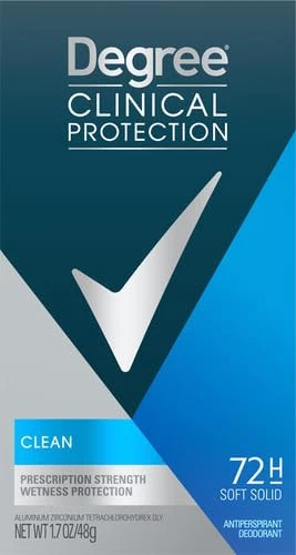 Product Description Degree Men, Clinical Protection, Antiperspirant Deodorant, Soft Solid, Clean, 1.7 Ounce (Pack Of 24) Degree Clinical Protection Long Lasting Antiperspirant Deodorant Stick, Clean, Degree Men Clinical Protection Clean Antiperspirant Deodorant delivers prescription-strength wetness protection with 72-hour sweat and odor control to keep you feeling dry and fresh. Our breakthrough motionsense technology works in sync with your body, all day long. This Antiperspirant deodorant releases a clean, masculine scent every time you move. The powerful, prescription-strength Antiperspirant deodorant responds when you need it most, so you can stay confident without having to worry about slowing down. PRESCRIPTION-STRENGTH PROTECTION: Active lives need Degree Men Clinical Protection Clean Antiperspirant Deodorant. This Antiperspirant for men delivers prescription-strength wetness protection MOTIONSENSE® TECHNOLOGY: Our breakthrough MotionSense® technology works in sync with your body all day long. This deodorant for men releases a subtle burst of fragrance every time you move READY FOR WHAT'S NEXT: Take on the day with Degree Men Clinical Protection Clean Antiperspirant Deodorant stick. Simply twist, glide, and move UNSTOPPABLE FRESHNESS: Stay fresh, longer with this Antiperspirant. Degree Men Clinical Protection Clean Antiperspirant Deodorant features a clean, masculine scent to keep you feeling energized RECYCLE WITH DEGREE: As well as increasing our use of reusable materials, we're making it easier for you to recycle our Antiperspirant and dry spray packaging Clean Clinical Antiperspirant Deodorant: Provides 24-hour protection against sweat and odor Neutral Scent: Unisex fragrance won't overpower you or your partner Ingredients Active ingredient: Aluminum Zirconium Tetrachlorohydrex GLY (20%); Inactive ingredients: Cyclopentasiloxane, dimethicone, paraffin, microcrystalline wax, fragrance (parfum), silica, caprylic/capric triglyceride, sodium starch octenylsuccinate, dimethicone crosspolymer, hydrated silica, maltodextrin, gelatin crosspolymer, hydrolyzed corn starch octenylsuccinate, cellulose gum, and BHT