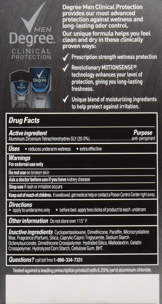Product Description Degree Men, Clinical Protection, Antiperspirant Deodorant, Soft Solid, Clean, 1.7 Ounce (Pack Of 5) Degree Clinical Protection Long Lasting Antiperspirant Deodorant Stick, Clean, Degree Men Clinical Protection Clean Antiperspirant Deodorant delivers prescription-strength wetness protection with 72-hour sweat and odor control to keep you feeling dry and fresh. Our breakthrough motionsense technology works in sync with your body, all day long. This Antiperspirant deodorant releases a clean, masculine scent every time you move. The powerful, prescription-strength Antiperspirant deodorant responds when you need it most, so you can stay confident without having to worry about slowing down. PRESCRIPTION-STRENGTH PROTECTION: Active lives need Degree Men Clinical Protection Clean Antiperspirant Deodorant. This Antiperspirant for men delivers prescription-strength wetness protection MOTIONSENSE® TECHNOLOGY: Our breakthrough MotionSense® technology works in sync with your body all day long. This deodorant for men releases a subtle burst of fragrance every time you move READY FOR WHAT'S NEXT: Take on the day with Degree Men Clinical Protection Clean Antiperspirant Deodorant stick. Simply twist, glide, and move UNSTOPPABLE FRESHNESS: Stay fresh, longer with this Antiperspirant. Degree Men Clinical Protection Clean Antiperspirant Deodorant features a clean, masculine scent to keep you feeling energized RECYCLE WITH DEGREE: As well as increasing our use of reusable materials, we're making it easier for you to recycle our Antiperspirant and dry spray packaging Clean Clinical Antiperspirant Deodorant: Provides 24-hour protection against sweat and odor Neutral Scent: Unisex fragrance won't overpower you or your partner Ingredients Active ingredient: Aluminum Zirconium Tetrachlorohydrex GLY (20%); Inactive ingredients: Cyclopentasiloxane, dimethicone, paraffin, microcrystalline wax, fragrance (parfum), silica, caprylic/capric triglyceride, sodium starch octenylsuccinate, dimethicone crosspolymer, hydrated silica, maltodextrin, gelatin crosspolymer, hydrolyzed corn starch octenylsuccinate, cellulose gum, and BHT