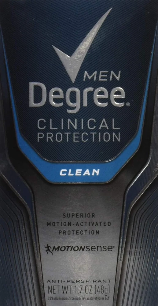 Product Description Degree Men, Clinical Protection, Antiperspirant Deodorant, Soft Solid, Clean, 1.7 Ounce (Pack Of 7) Degree Clinical Protection Long Lasting Antiperspirant Deodorant Stick, Clean, Degree Men Clinical Protection Clean Antiperspirant Deodorant delivers prescription-strength wetness protection with 72-hour sweat and odor control to keep you feeling dry and fresh. Our breakthrough motionsense technology works in sync with your body, all day long. This Antiperspirant deodorant releases a clean, masculine scent every time you move. The powerful, prescription-strength Antiperspirant deodorant responds when you need it most, so you can stay confident without having to worry about slowing down. PRESCRIPTION-STRENGTH PROTECTION: Active lives need Degree Men Clinical Protection Clean Antiperspirant Deodorant. This Antiperspirant for men delivers prescription-strength wetness protection MOTIONSENSE® TECHNOLOGY: Our breakthrough MotionSense® technology works in sync with your body all day long. This deodorant for men releases a subtle burst of fragrance every time you move READY FOR WHAT'S NEXT: Take on the day with Degree Men Clinical Protection Clean Antiperspirant Deodorant stick. Simply twist, glide, and move UNSTOPPABLE FRESHNESS: Stay fresh, longer with this Antiperspirant. Degree Men Clinical Protection Clean Antiperspirant Deodorant features a clean, masculine scent to keep you feeling energized RECYCLE WITH DEGREE: As well as increasing our use of reusable materials, we're making it easier for you to recycle our Antiperspirant and dry spray packaging Clean Clinical Antiperspirant Deodorant: Provides 24-hour protection against sweat and odor Neutral Scent: Unisex fragrance won't overpower you or your partner Ingredients Active ingredient: Aluminum Zirconium Tetrachlorohydrex GLY (20%); Inactive ingredients: Cyclopentasiloxane, dimethicone, paraffin, microcrystalline wax, fragrance (parfum), silica, caprylic/capric triglyceride, sodium starch octenylsuccinate, dimethicone crosspolymer, hydrated silica, maltodextrin, gelatin crosspolymer, hydrolyzed corn starch octenylsuccinate, cellulose gum, and BHT