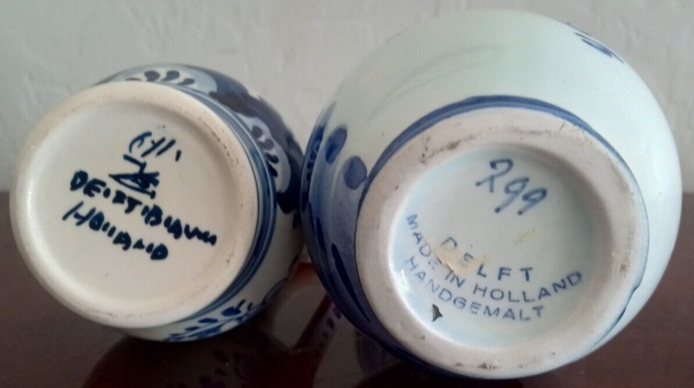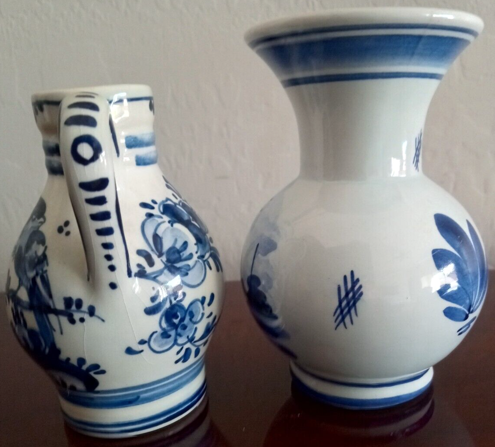 This charming miniature vase and pitcher set features a beautiful Delft-style floral pattern for the pitcher and landscape theme for the vase within a Dutch colonial theme. These pieces are hand-painted with a glossy finish and feature a stunning blue and white color scheme. The vase stands at 4.0" tall and the pitcher measures 3.75". This set is an original vintage presentation of art pottery from the Netherlands signed with a painted backstamp. They belong to the category of decorative pottery and glassware. This set is perfect for collectors of unique decorative treasures for the home.