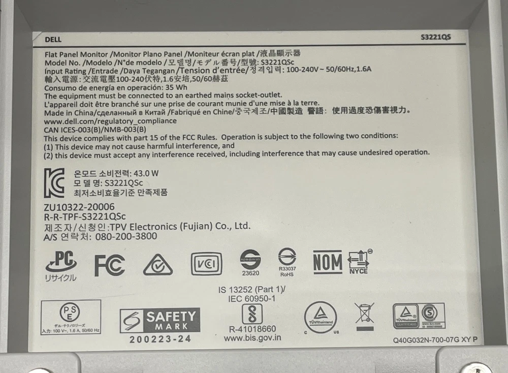 Response Time: 4 ms Refresh Rate: 60 Hz Brand: Dell UPC: 884116375623 gtin13: 884116375623 Screen Size: 31.5 in MPN: S3221QS Model: S3221QS