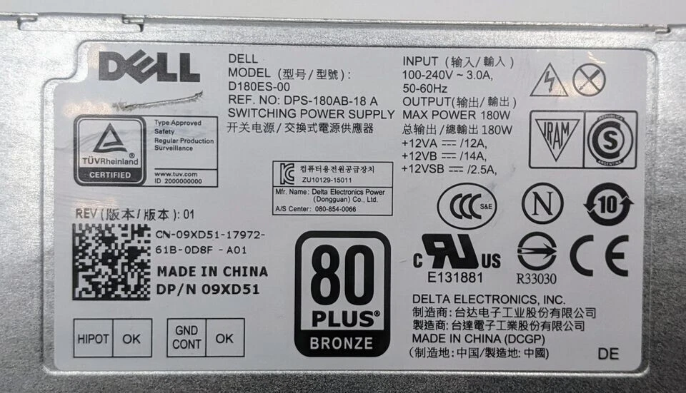 Dell OptiPlex 3040 5040 7040 D180ES-00 SFF 180W Power Supply- 9XD51 J32