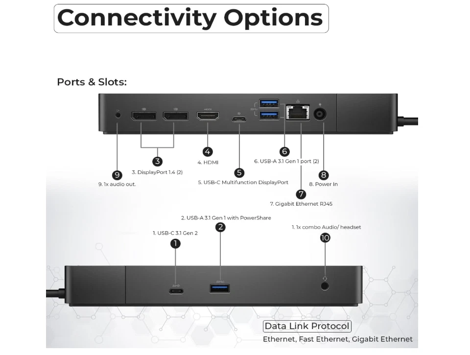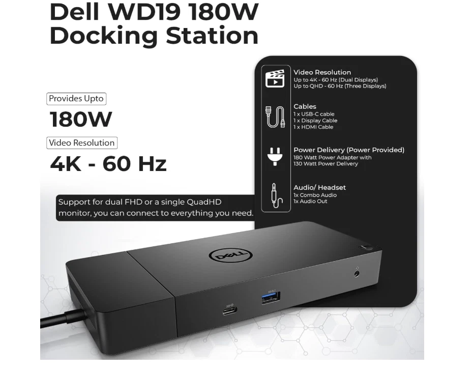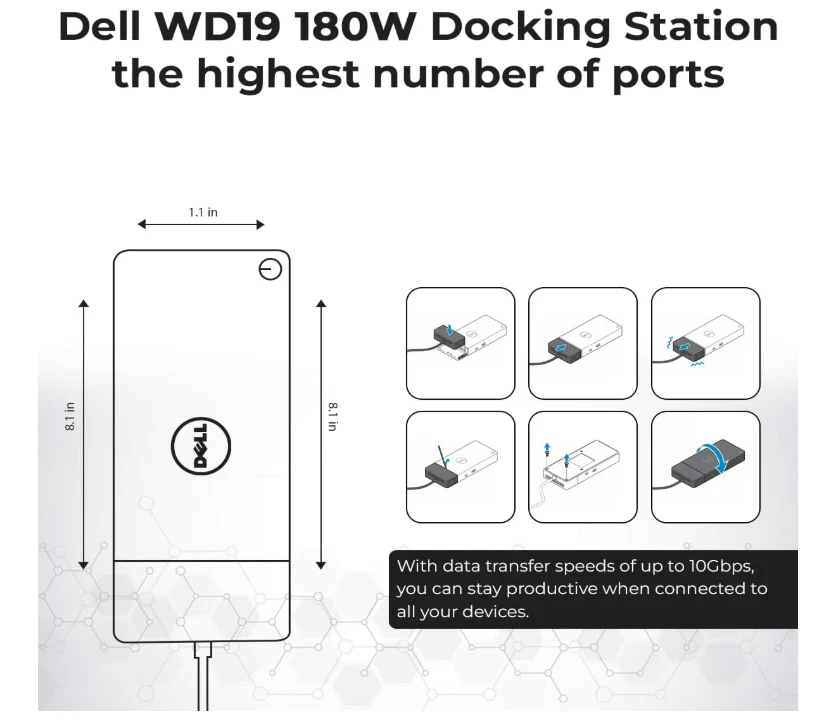 Ports: 1x USB-C 3.1 (Gen 2), 1x USB-A 3.1 (Gen 1 with PowerShare), 2x USB-A 3.1 (Gen 1), 1x combo Audio/ headset, 1x audio Out. Dimensions: 8.1 x 3.5 x 1.1 inches. Weight: 20.63 ounce. [One Device to Rule Them All] - Effortlessly connect your peripherals, monitors, and devices with the Dell WD19 Dock. Designed for laptops compatible with USB-C DisplayPort or Thunderbolt 3, it simplifies your setup and maximizes productivity. [Broad Compatibility] - This Dell USB-C hub dock supports various devices, including select models from the Inspiron, Venue, Precision, XPS, and Latitude series. Verify compatibility prior to purchase for optimal use. Package Includes - Dell WD19 180W Docking Station, Original 180W Power Adapter, 1x HDMI Cable, 1x Display Port Cable, 1x USB-C Cable + Microfiber Cloth Included. ππππ] - Before purchasing please make sure your computer is USB C or Thunderbolt Compatible depending on the dock you are purchasing. If you are running into issues please try updating the dock firmware to make it compatible with your computer.