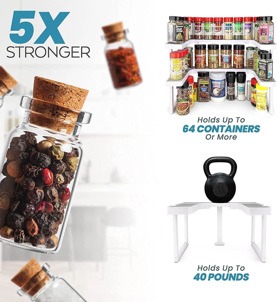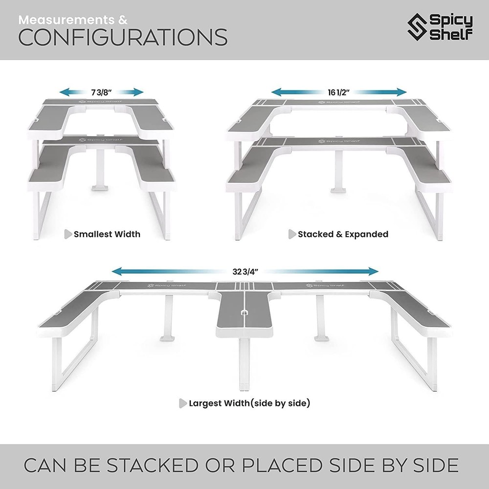 Check out the Deluxe for your pantry storage, a sturdy expandable spice rack that'll amp up your kitchen organization game. This shelf organizer is not just your average pantry organizer, it's five times stronger than the original, able to hold up to 40 pounds. That’s a whole lot of spices! Imagine the convenience of having all your spices neatly organized with this shelf organizer kitchen cabinet spice. With the capability to hold up to 64 spices, you'll quickly find the you need. Plus, it's expandable from 7.5” to 17” wide and 10 3/8” deep, making this seasoning organizer cabinet versatile for any cabinet size. The Deluxe spice rack cabinet organizer is not just for spices. You can use this cabinet spice rack to bottles, craft supplies, nail polish–you name it! This expandable shelf organizer is a game-changer in keeping your items tidy and reachable. The new and improved spice storage organizer design features a non-slip surface. This means your items won't slide around, they'll stay put right where you want them. This shelf is also stackable, transforming your messy cabinet into an organized masterpiece. Remember, this cabinet spice rack product is a set of shelves, offering double the power of the usual kitchen shelf organizer. Also, note that it's easy to assemble, but it does not come with the items you choose to on it. So, go on, get your Deluxe today and start organizing like a ! 5x Stronger - New and improved Deluxe! 5 times stronger than the original. Now holds up to 40 pounds Non Slip Surface - Now with this new grey rubber "non-slip" surface of the shelf organizer, bottles do not slide around on the shelfs. It helps items stay put. Organize up to 64 spices - See them all at a glance! Deluxe is the ultimate stackable cabinet organizer! It can turn a mess of spices into an organized masterpiece! Each Deluxe can be adjust to as narrow as 7.5” to as wide as 17”. The depth of the shelf is 10 3/8”. Deluxe is not just for Spices. With over a million already sold, satisfied customers everywhere are using their Spicy Shelve to organize EVERYTHING in their cabinets! Spices, & bottles, fingernail polish, crafts and more!