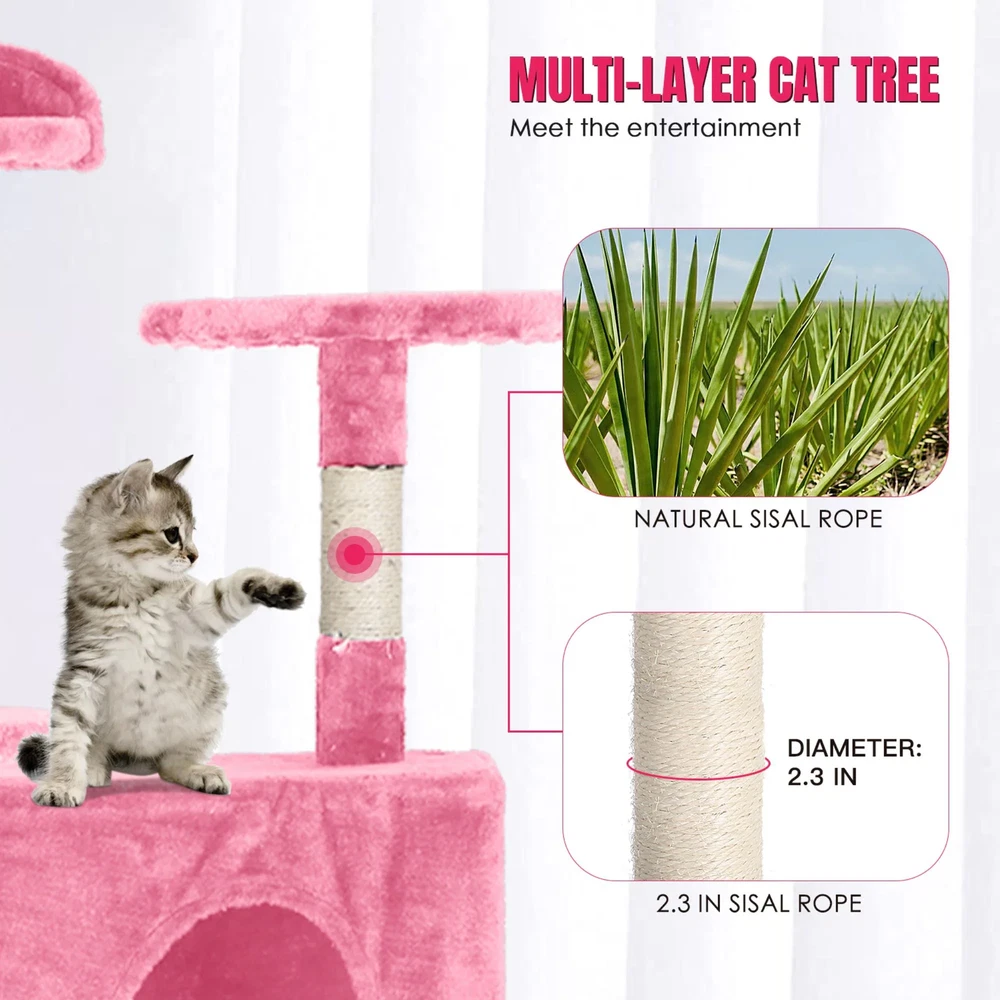 Spoil your feline companion with this luxurious cat tree tower. With three platforms for climbing and perching, two cozy cat condos for napping and hiding, and a built-in scratch post covered in durable sisal rope, this cat tree offers endless entertainment and comfort. The plush faux fur fabric adds a touch of elegance to any space while providing a cozy retreat for your cat to relax and play. Features: Includes one (1) multi-level cat play house tower Available in multiple color options Two (2) size options: 54-inch tall or 70-inch tall MULTI-LAYER STRUCTURE: Various perch platforms and condos to offer space to stretch or curl up BUILT-IN SCRATCH POST: Three (3) scratching levels with natural sisal rope SECURE WALL ANCHOR: Includes anti-tip wall anchor kit to prevent tipping Three (3) perches at different elevations Two (2) cat condos, small and large, for a cozy quiet area Faux fur exterior over high-quality particle board construction is plush and comfortable Two (2) hanging toy balls to keep your cat or kitten entertained Includes one (1) ladder style ramp at base for easy climbing Great for kittens, adult and senior cats Assembly required, tools included Dimensions: 54-inch option: 54 inches high x 19.3 inches wide x 19.3 inches deep 70-inch option: 70 inches high x 21.3 inches wide x 21.3 inches deep Whether you are a deal seeker, trendsetter or just window shopping, Furniture of America® is there for your every need. You'll find that we offer every style, from rustic farmhouse and urban industrial to French antique, mid-century modern, and glamorous chic; we welcome you to explore our ample style possibilities to find the perfect pairing for your personality. Furniture of America ® is proud to be the family friend that always has your back. Product Care: Place cat tree on the floor against a wall corner Secure tower to wall with included wall anchor strap for safety Do not allow children or young adults to climb or play with the product Avoid humid environments This product will ship to you in one (1) box.
