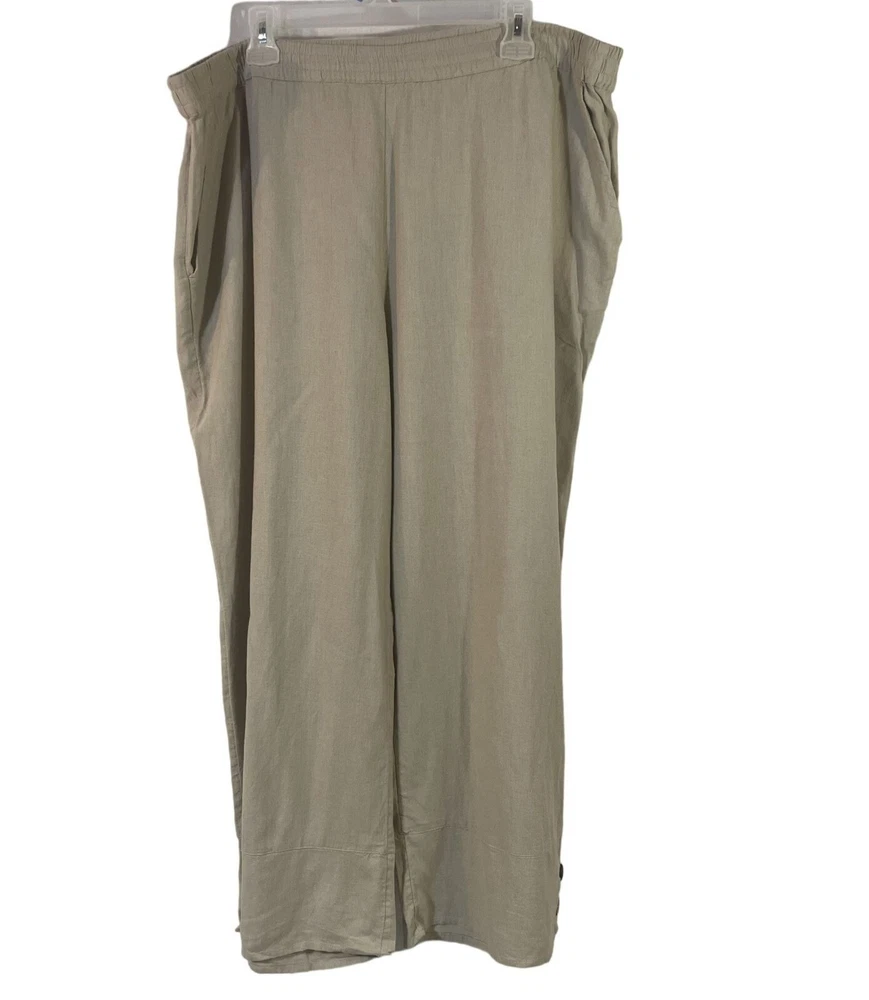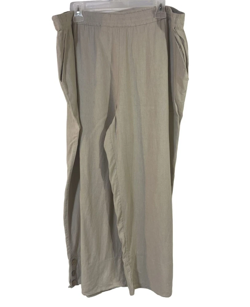 Fabrication: woven Features: side buttons at hem, elastic waistband, side pocket Rise: slightly below the waist Fit: semi-fitted; follows the lines of the body with added wearing ease Leg Shape: wide leg; widens fashionably from thigh to leg opening Inseam: missy/plus inseam 28" Content: 55% linen/45% viscose Care: machine wash, tumble dry Imported Features: • Side Button Ankle Size: Womens XS Condition: New Without Tags