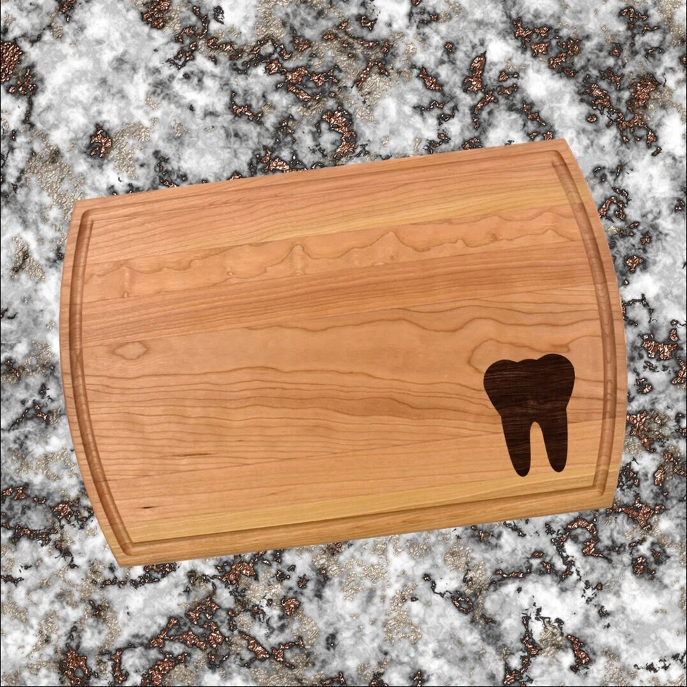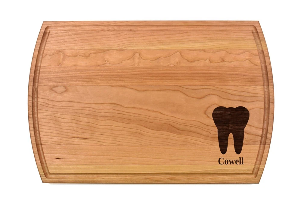 Design: Personalized Dentist Tooth Cutting Board or Charcuterie Serving Tray All items ship via USPS - please make sure your address is correct :-) Whether used as a charcuterie serving tray for snacks or cutting board, our bamboo, walnut and cherry custom boards are the perfect addition for the home and make the perfect gift for your loved one celebrating a birthday, anniversary, new home, wedding, etc! *** FEATURES *** • SIZES: We have multiple styles and sizes available. To see our current sizes available, click the drop-down menu. The photo slide contains a photo showing each side by side. Please note, the board with the juice groove only has the groove on the front side of the board. • THICKNESS: Bamboo Boards - Approximately 1/2" Thick; Walnut & Cherry Boards - Approximately 3/4” Thick • UNIQUE: Every board is unique with the grain and coloring varying throughout - no board is the same! • CARE INSTRUCTIONS: Hand wash only with warm water. Do not soak. Please apply mineral oil throughout the board’s life. • PERSONALIZATION/CUSTIMIZATION: Do you want the text placed differently on the board? Please don’t hesitate to contact us. All personalization notes can be entered in the personalization box when checking out. • SHIPPING: All cutting boards ship within 2 to 5 business days. • WHOLESALE ORDERS: Please don’t hesitate to contact us for information about wholesale orders. Processing times for larger orders may change. • NOTE: Colors can vary a bit on different monitors and screens. Any props included in photos are not included. Please be sure to double-check your address to make sure it is accurate for USPS delivery. If a package is returned to us due to an invalid address, the buyer is responsible for all additional shipping charges. We appreciate you supporting small business – best wishes! For items ordered with simple edits, we do not send proofs since the layout doesn't change from the example(s). However, in the event there are requests that change the layout from the example(s), we do send proofs for approval before making the product. If you'd like a proof before we make the product, please note so in the personalization box.