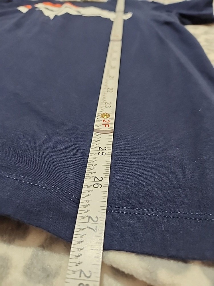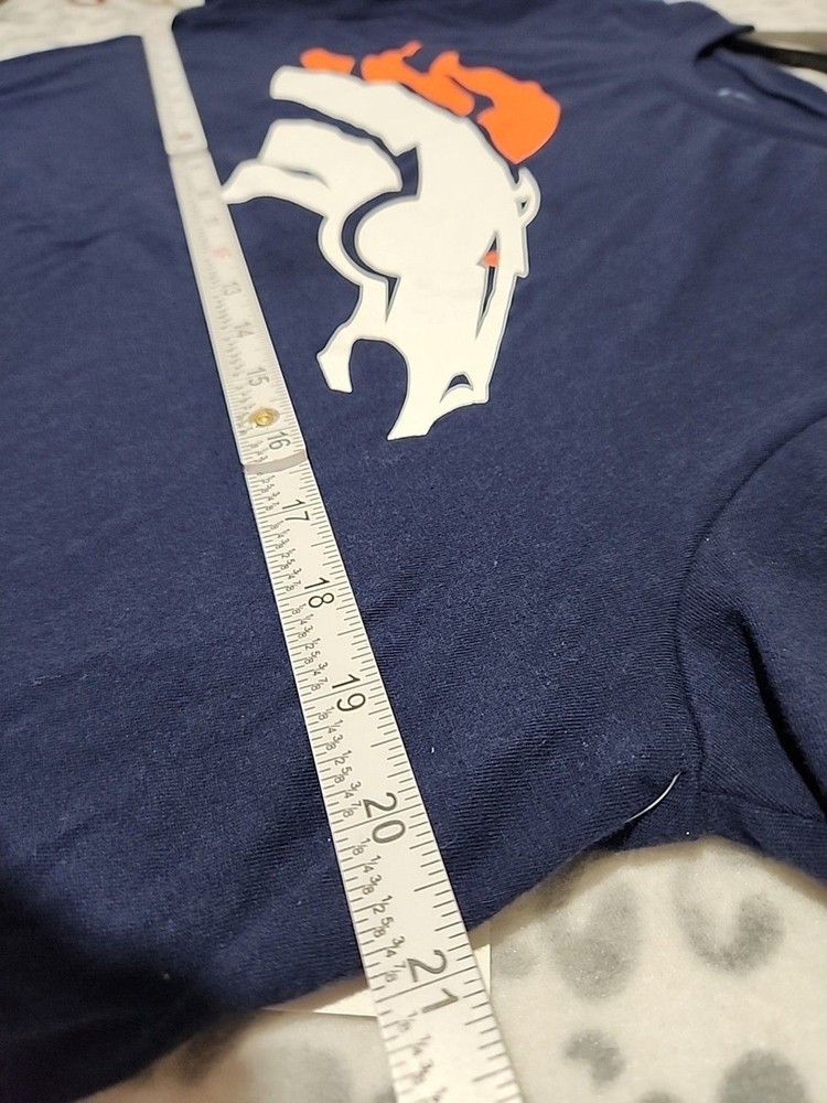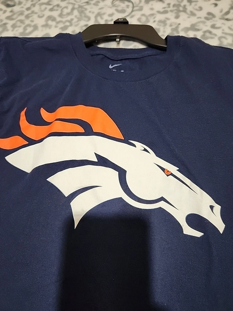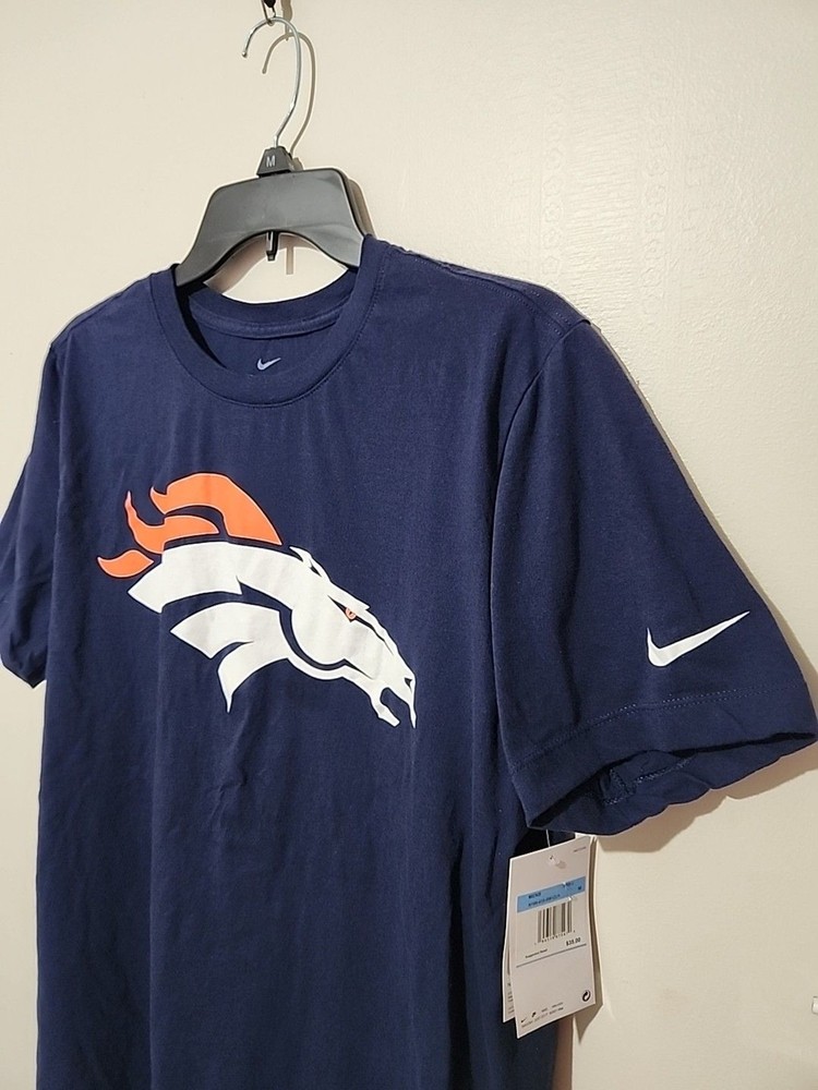 This Denver Broncos T-Shirt is a men's medium size in navy blue, featuring the Nike logo on the short sleeve. Made of knit cotton material, this T-shirt is suitable for all seasons, specifically summer, fall, and spring. It is a solid patterned shirt with a crew neck and regular fit, perfect for outdoor and sports-themed occasions. The Denver Broncos character and theme make it a must-have for fans of the team. BOX 23