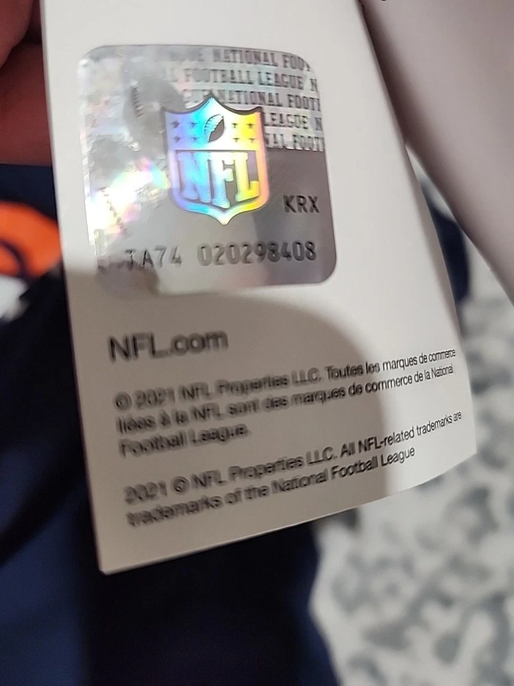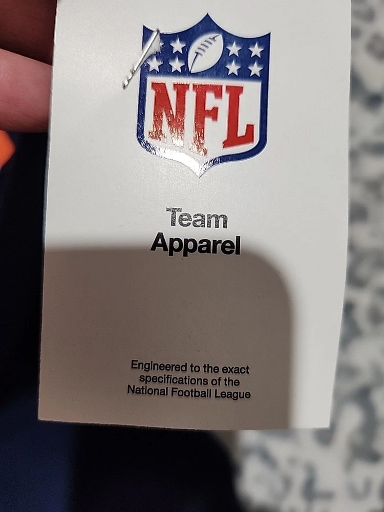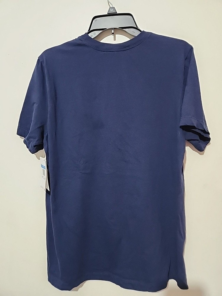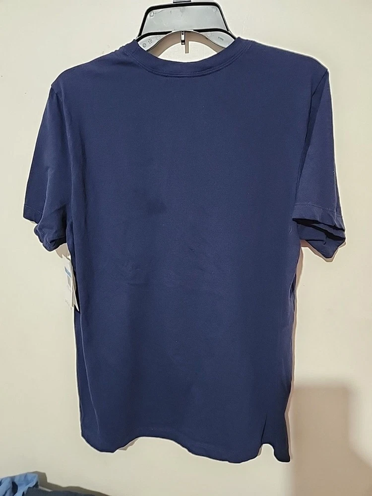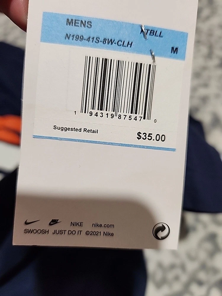 This Denver Broncos T-Shirt is a men's medium size in navy blue, featuring the Nike logo on the short sleeve. Made of knit cotton material, this T-shirt is suitable for all seasons, specifically summer, fall, and spring. It is a solid patterned shirt with a crew neck and regular fit, perfect for outdoor and sports-themed occasions. The Denver Broncos character and theme make it a must-have for fans of the team. BOX 23