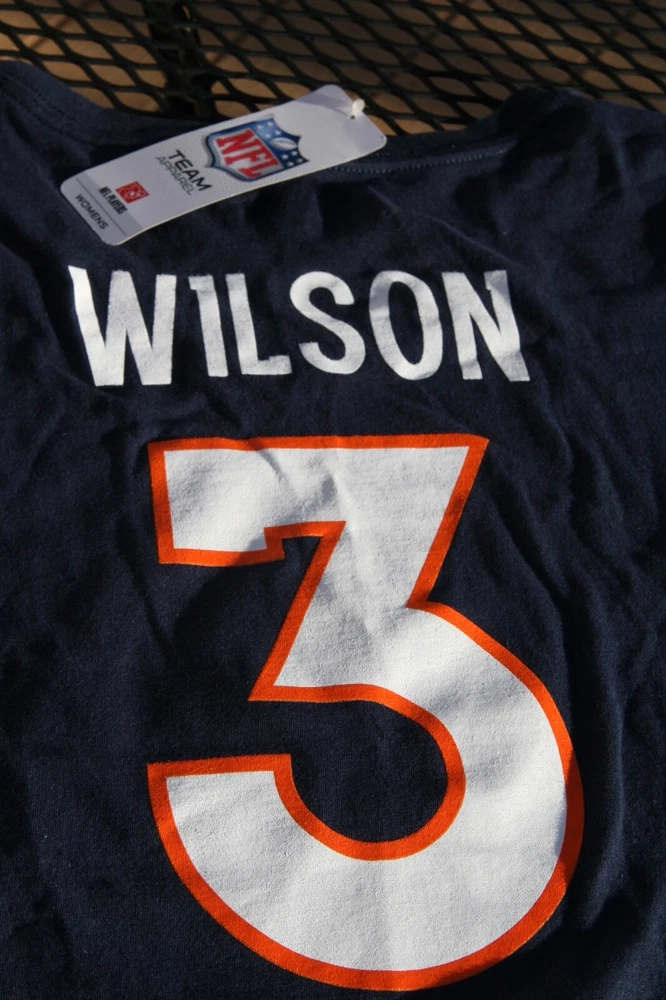 Women's L V-neck Denver Broncos Wilson #3 T-Shirt New with tags Great gift for the Bronco Fan ! To upcycle, I reuse shipping material as often as possible. Buy more from my store and save on shipping.