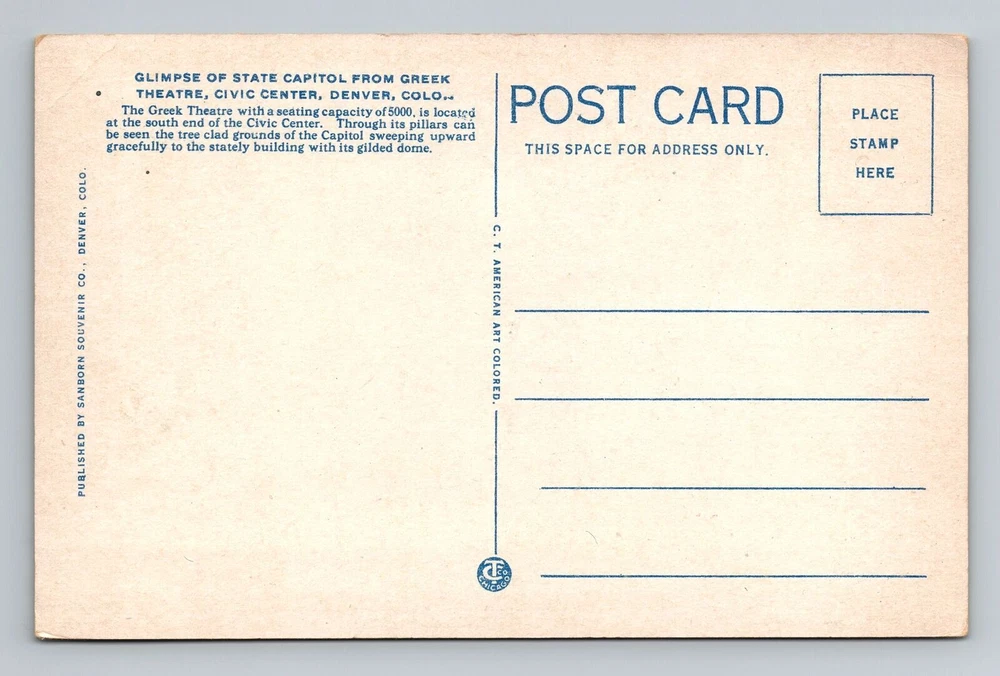 Denver CO-Colorado, Glimpse State Capitol From Greek Theatre, Vintage Postcard