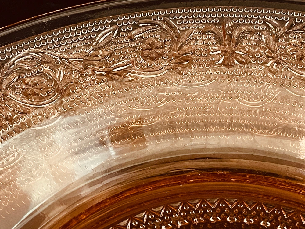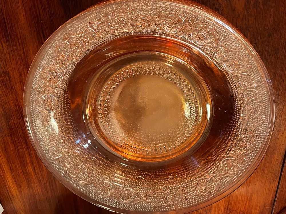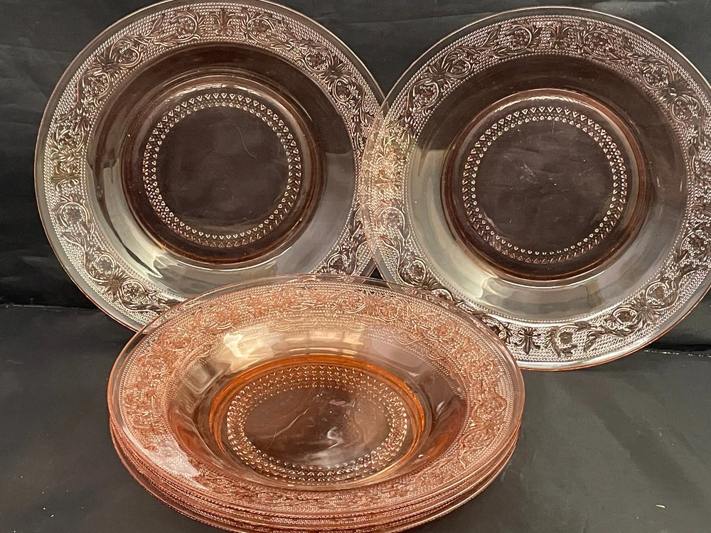 Pink Depression Shallow Soup Bowl Salad Plate 9" Beaded Center Lot of 5 LOT OF 5 These measure 9" GREAT CONDITION NO DEFECTS no Chips nor cracks Minor Wear from Age Free Shipping for the Buyer