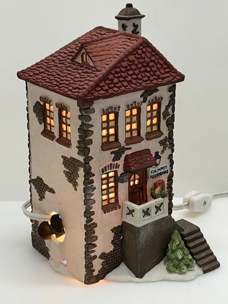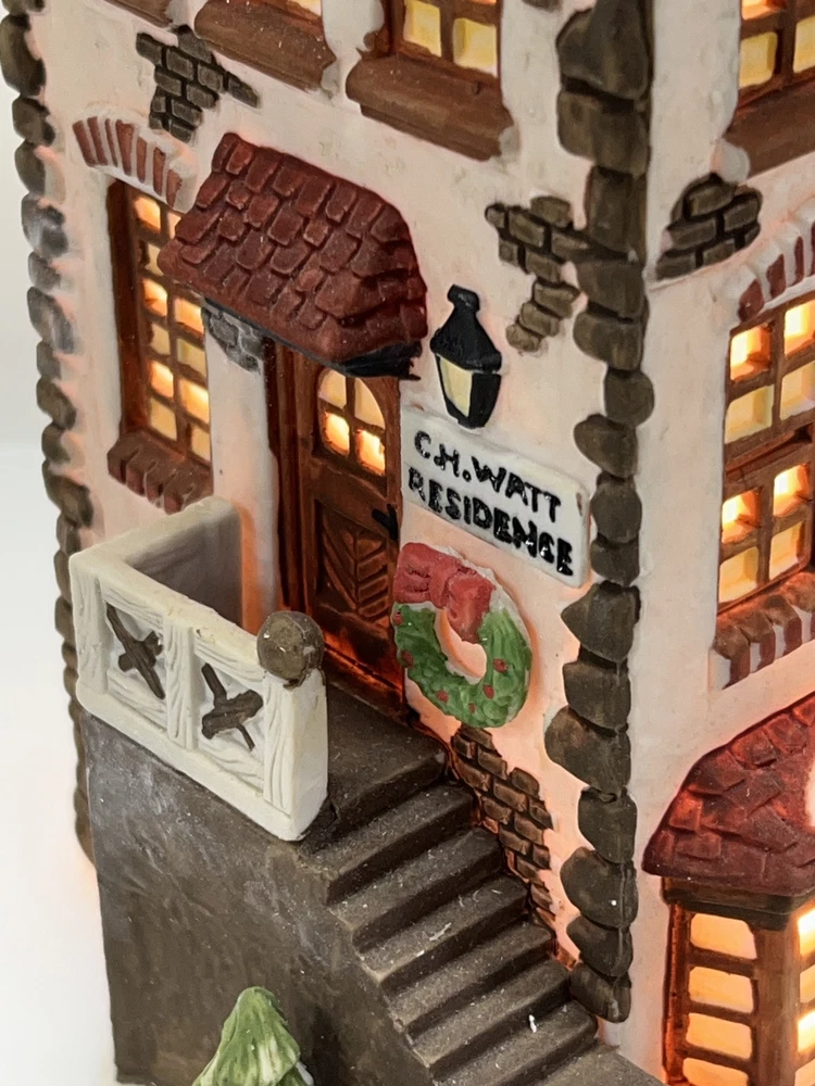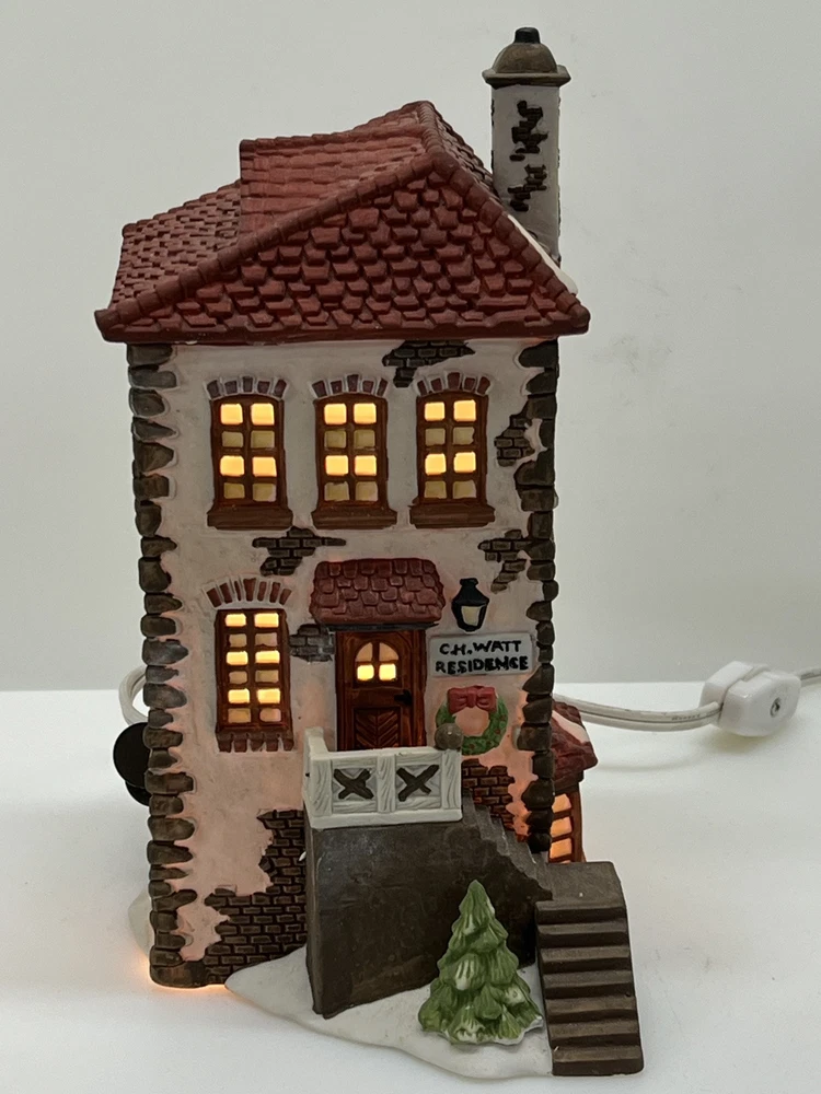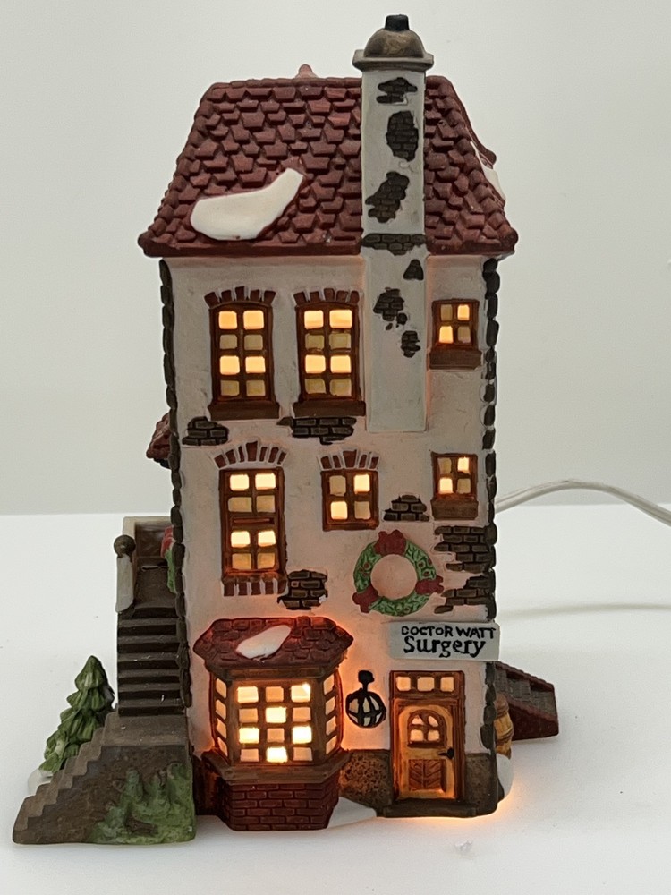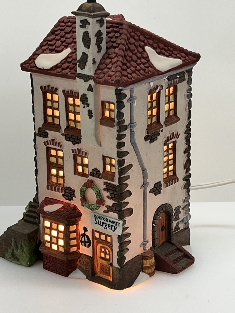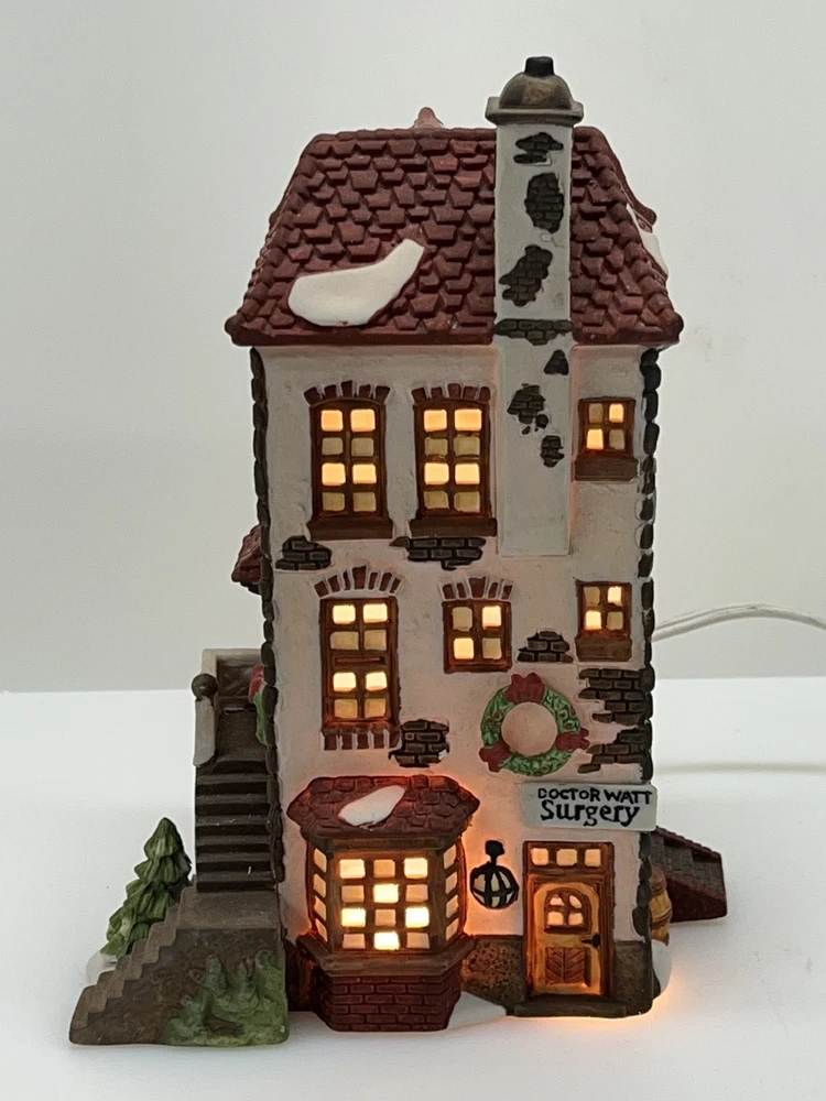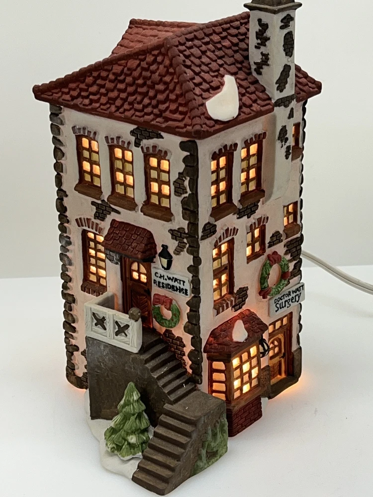 Dept 56 "C.H. Watt Physician" from the Heritage Village Collection is a medium-sized illuminated porcelain house suitable for a Christmas village display. This Victorian-style house, part of the Dickens Village Series, features hand-painted details and is boxed. It is an original retired item from 1990, portraying the character C. H. Watt Physician in a whimsical, multicolor design. Perfect for a seasonal display in any room during the late 20th century. Incredible detail! All original packaging including light & cord .