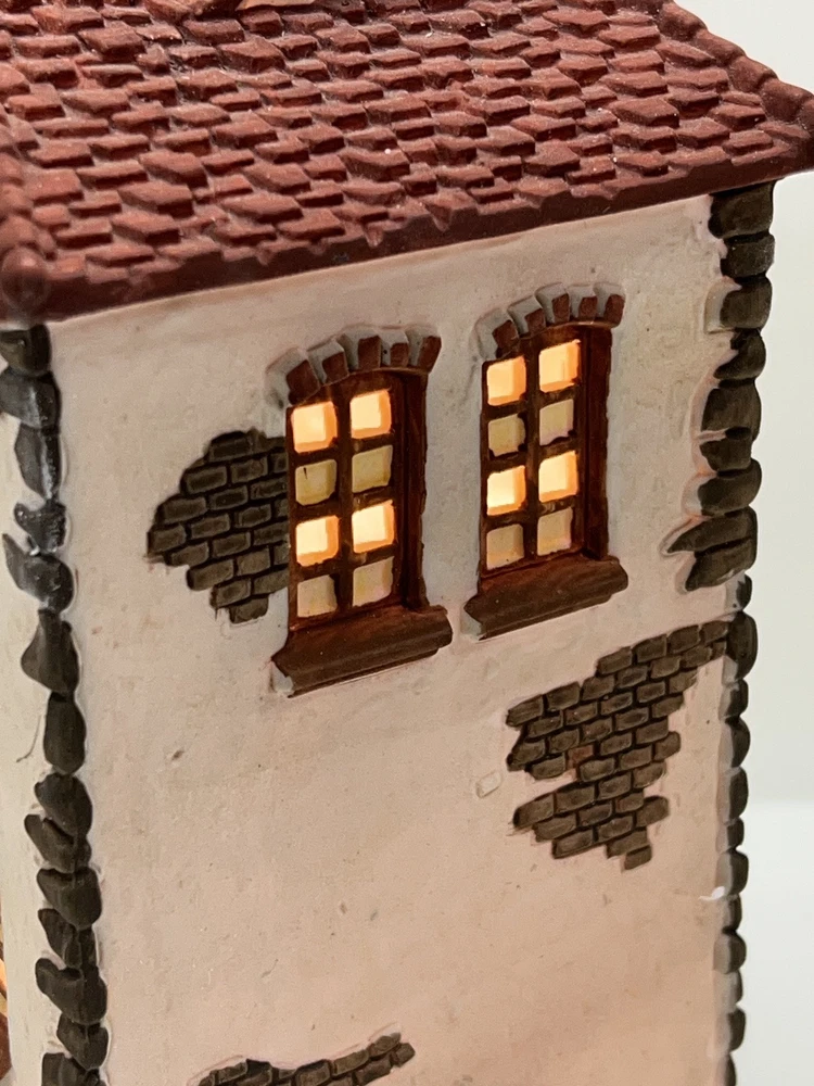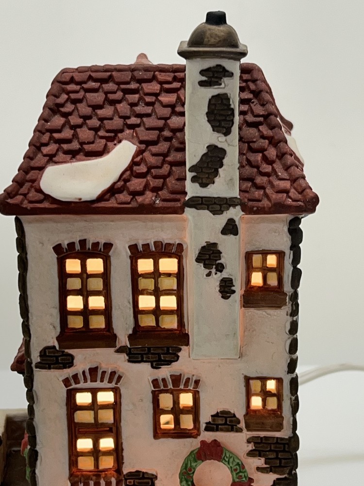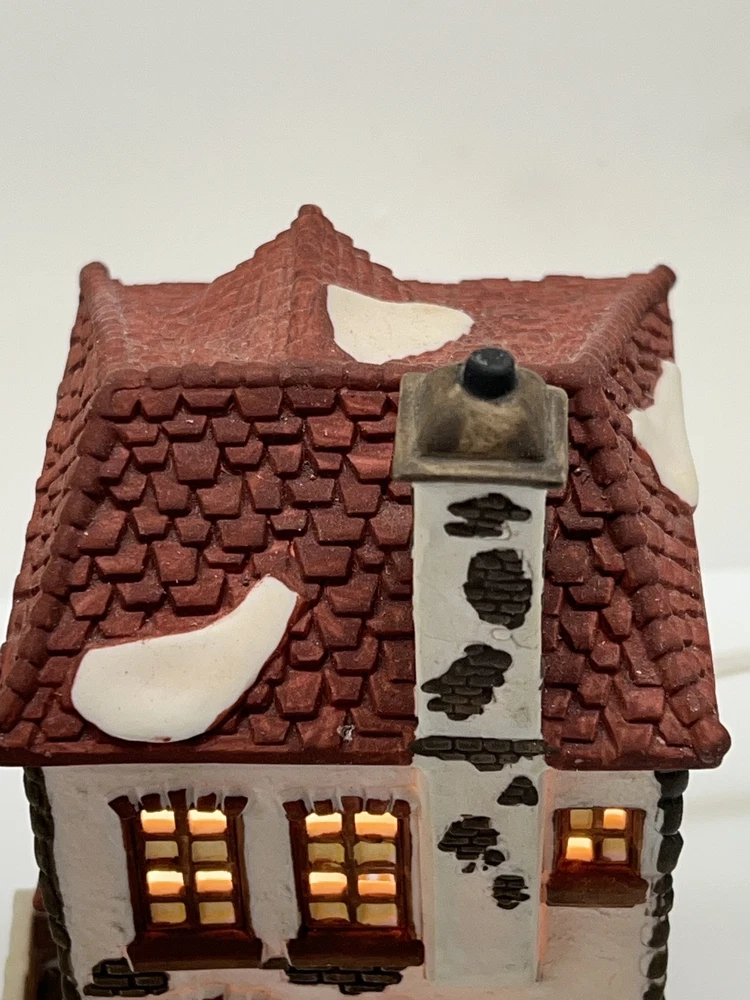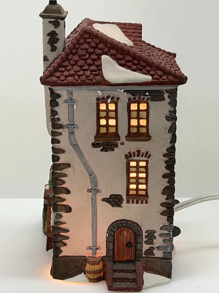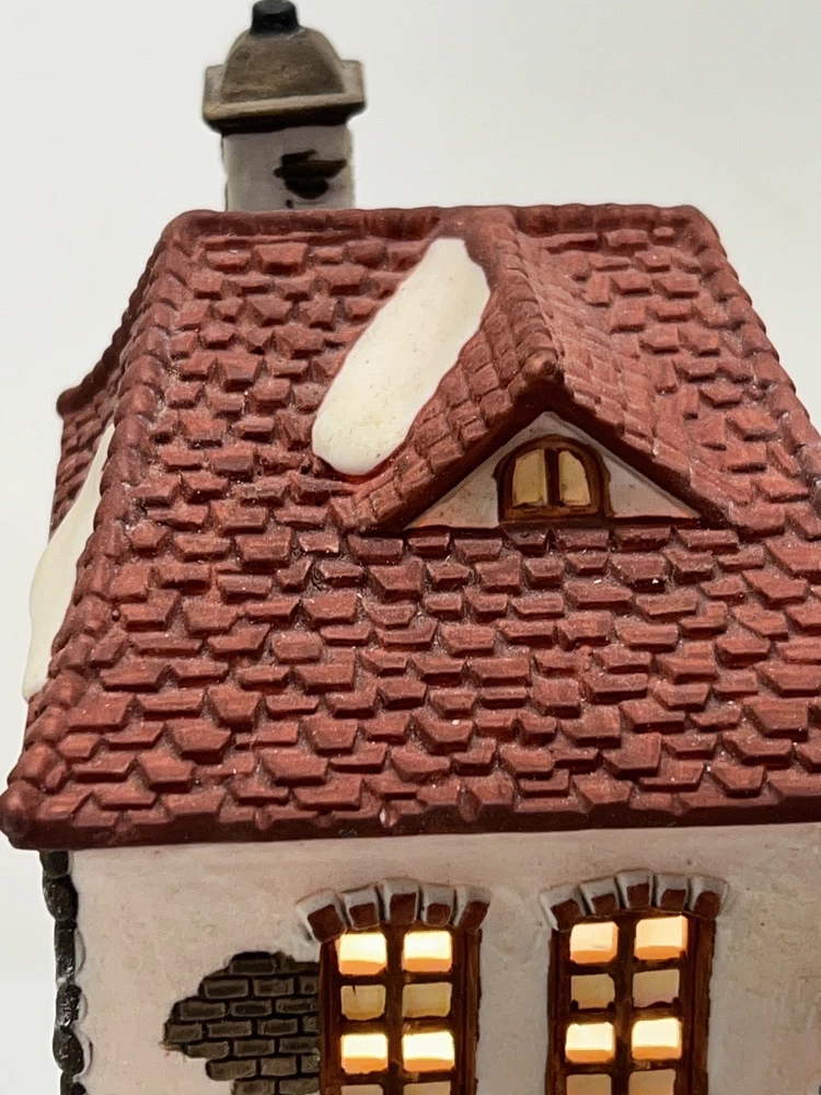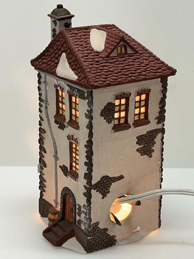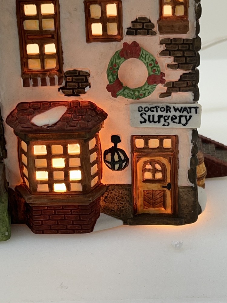 Dept 56 "C.H. Watt Physician" from the Heritage Village Collection is a medium-sized illuminated porcelain house suitable for a Christmas village display. This Victorian-style house, part of the Dickens Village Series, features hand-painted details and is boxed. It is an original retired item from 1990, portraying the character C. H. Watt Physician in a whimsical, multicolor design. Perfect for a seasonal display in any room during the late 20th century. Incredible detail! All original packaging including light & cord .