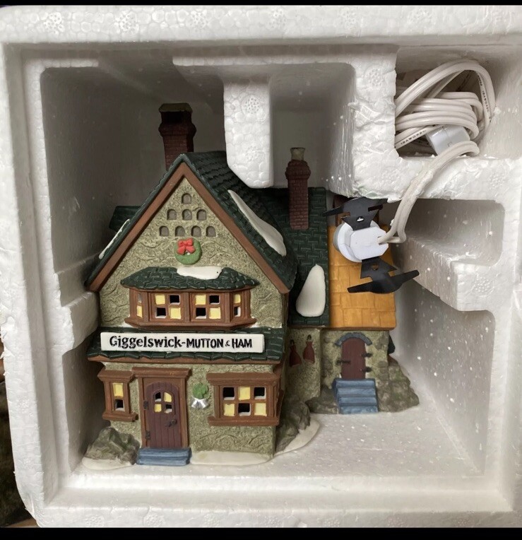 This is a small, hand-painted ceramic and porcelain Christmas village house from Department 56's Dickens Village collection. The Giggelswick Mutton & Ham house is a Victorian-style building with a matte painted finish. It features illuminated windows and a thatched roof, and is suitable for display on a window, floor, stairs, or furniture. The house measures 7 inches tall, 7 1/4 inches wide, and 7 inches deep, and weighs 2 pounds. It was manufactured in Taiwan in 1994 and is a retired, original piece. The house comes in a box and is part of a Dickens Christmas village theme.