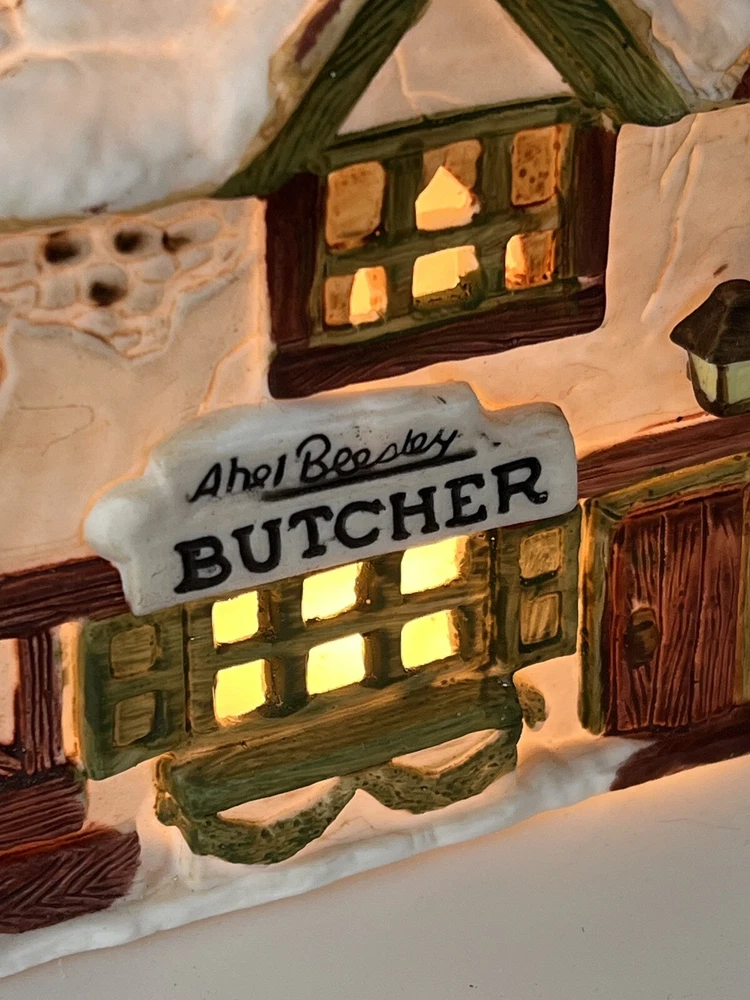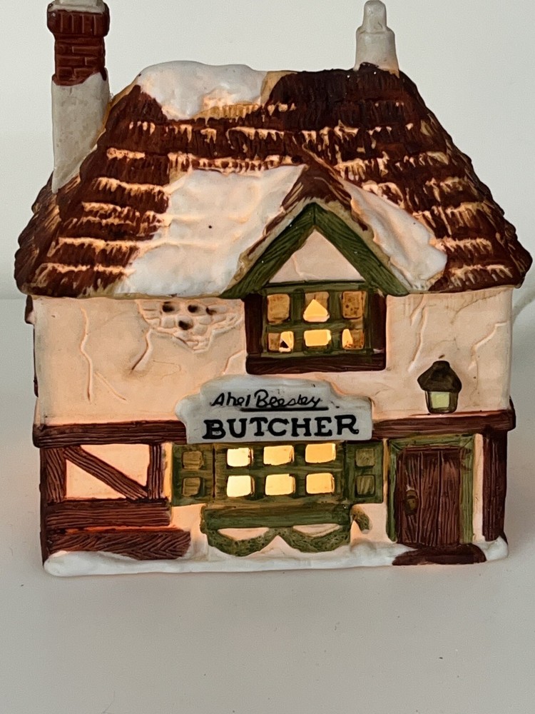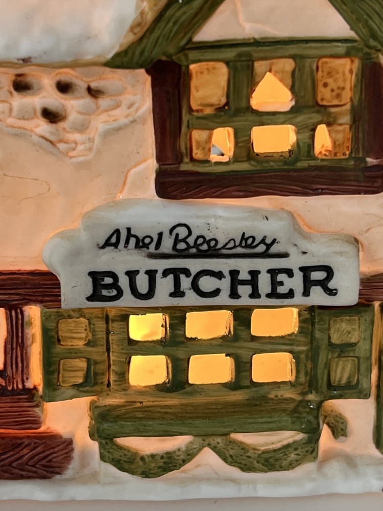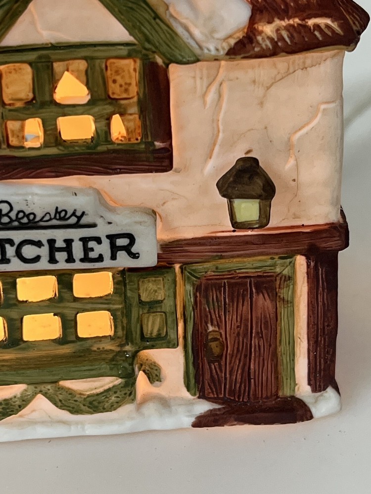 This is a Dept 56 Shops of Dickens Village Heritage Beesley Butcher figurine from 1984. It is a small, illuminated Victorian-style porcelain building featuring Beesley Butcher in a whimsical Christmas Village theme. The hand-painted piece has a 3D effect, multicolor finish, and measures 5" in length, 4" in width, and 6" in height. It is suitable for seasonal display in any room and is part of the Dickens Village collection. 1984 !!! Excellent condition!! comes with all original packaging including cord & light .