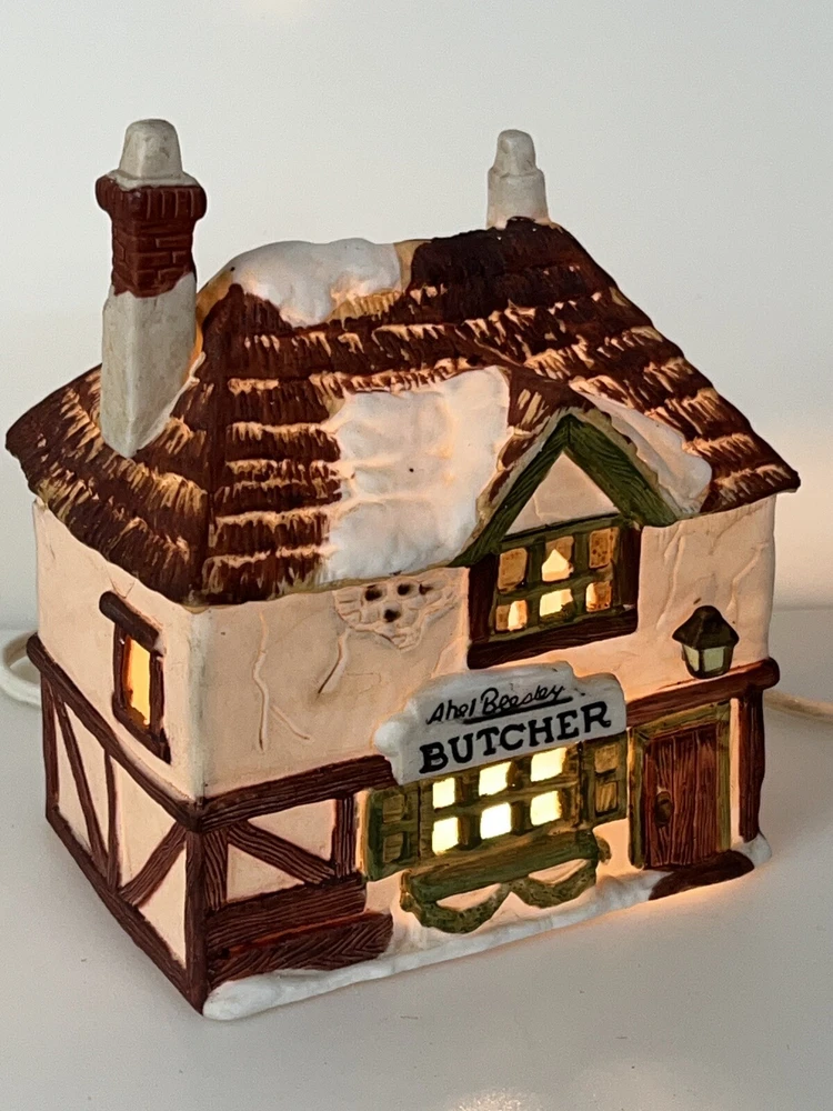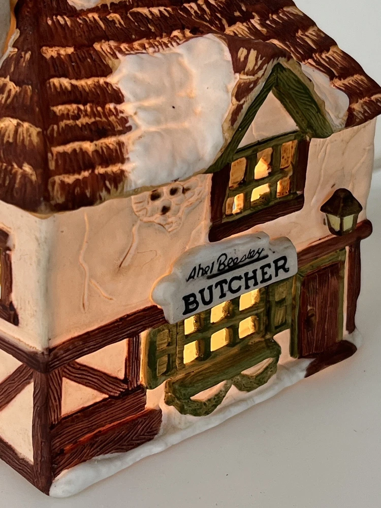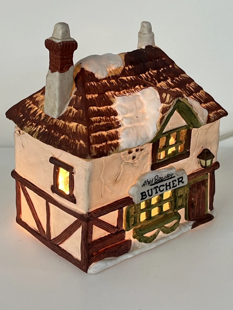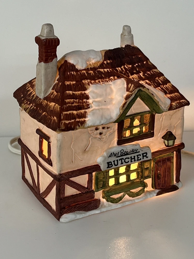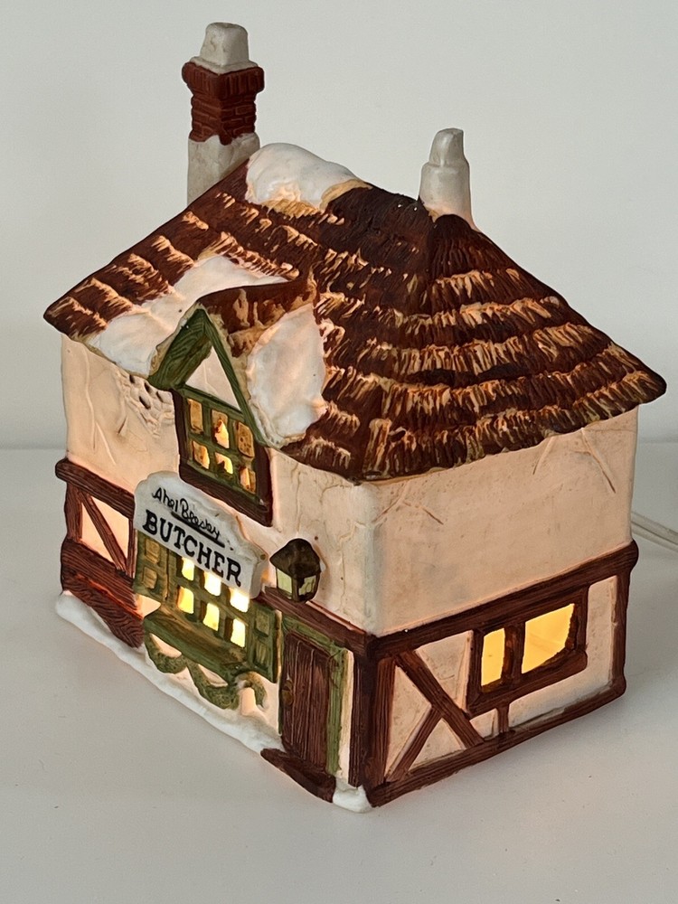 This is a Dept 56 Shops of Dickens Village Heritage Beesley Butcher figurine from 1984. It is a small, illuminated Victorian-style porcelain building featuring Beesley Butcher in a whimsical Christmas Village theme. The hand-painted piece has a 3D effect, multicolor finish, and measures 5" in length, 4" in width, and 6" in height. It is suitable for seasonal display in any room and is part of the Dickens Village collection. 1984 !!! Excellent condition!! comes with all original packaging including cord & light .