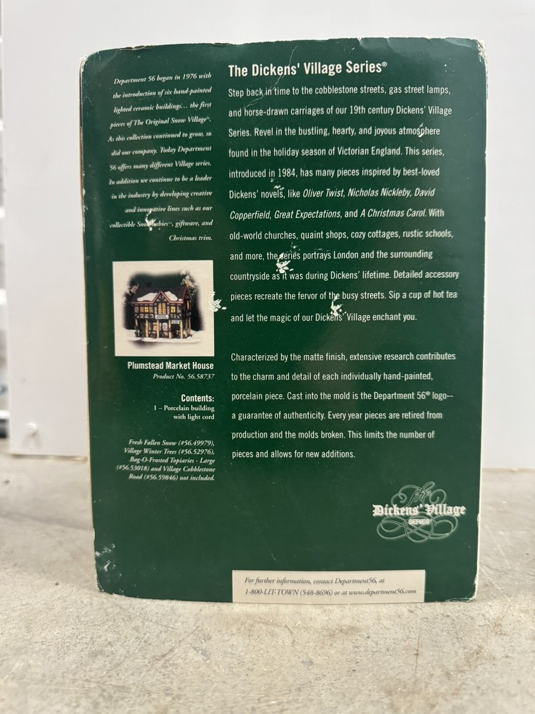 Embrace the charming atmosphere of the Dickens Village with the PLUMSTEAD MARKET HOUSE, a delightful addition to any holiday collection. This intricately designed lighted building by Department 56 captures the essence of Victorian England, showcasing the fine craftsmanship and attention to detail that the brand is known for. The piece, with its unique MPN 58737, is a must-have for enthusiasts of historical-themed villages. It serves as a beautiful display piece during the festive season and adds a touch of nostalgia to your holiday decor. Whether for personal enjoyment or as a thoughtful gift, this Dickens Village piece is sure to enchant.