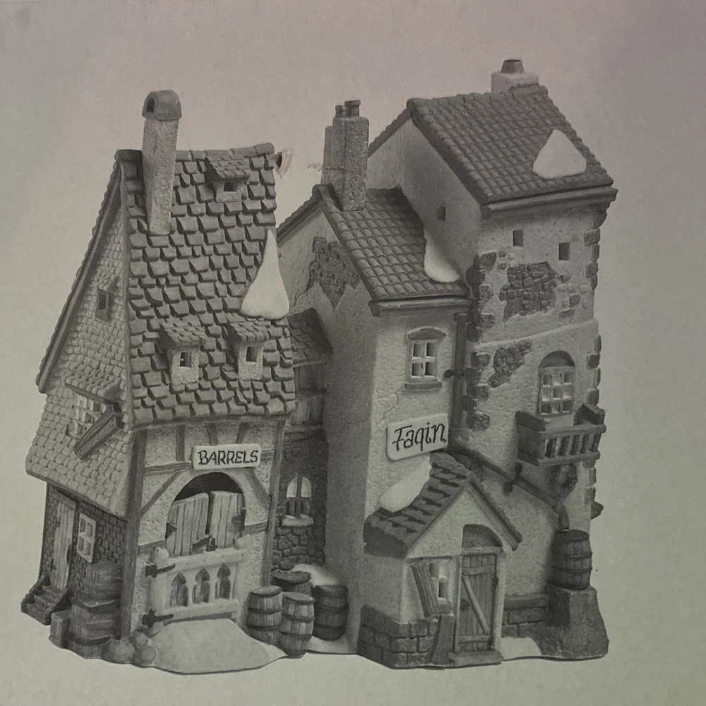 The product is a vintage Department 56 Dickens Village Series house from 1990, titled "Oliver Twist 'Fagin's Hideaway'. This asymmetrical, Victorian-style ceramic and porcelain building is hand-painted and illuminated, perfect for Christmas decor. The medium-sized piece features intricate details and a textured matte finish, making it suitable for display on a window, floor, or furniture in any room. Packaged in a box, this collectible item is a part of the Dickens Village collection, adding a touch of nostalgia and seasonal charm to any holiday display.